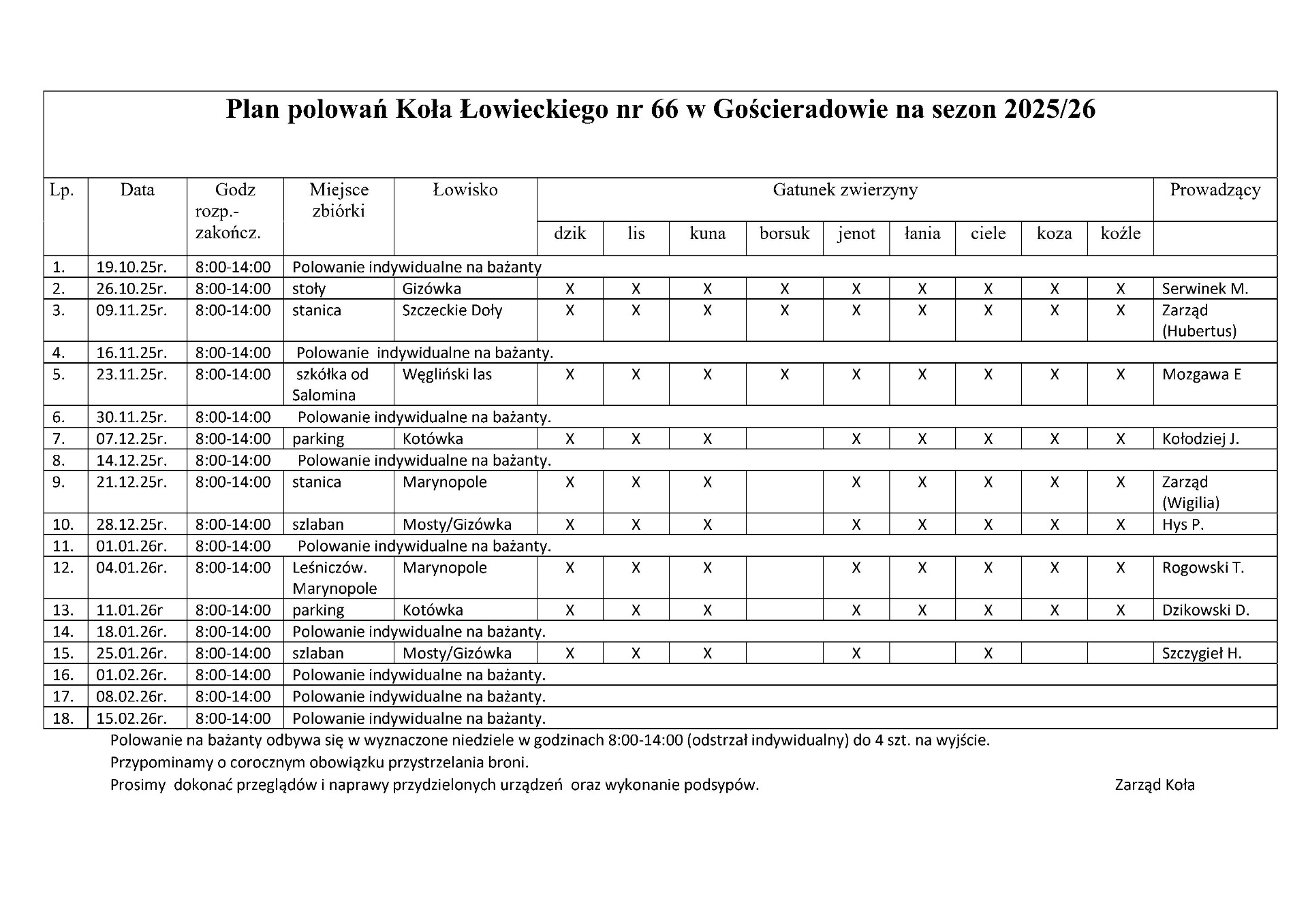 Załącznik: Terminarz polowań zbiorowych Koła Łowieckiego nr 66 „ROGACZ” w Gościeradowie na sezon 2025/2026