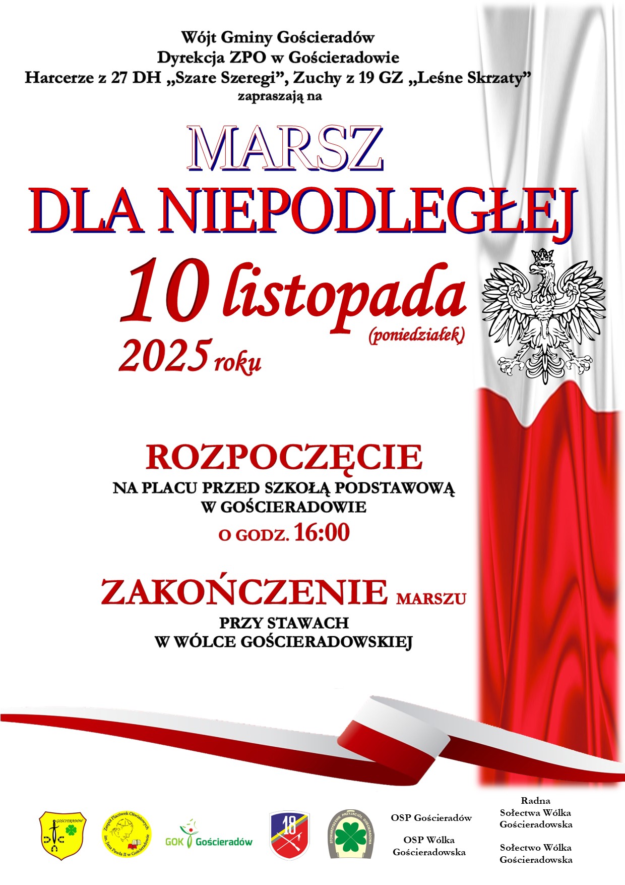 Serdecznie zapraszamy na Uroczystą Mszę Świętą w intencji Ojczyzny z okazji NARODOWEGO ŚWIĘTA NIEPODLEGŁOŚCI, która odbędzie się w dniu 11 listopada 2025 r. o godz. 11:00 w Kościele pw. Św. Stanisława i Św. Jana Chrzciciela w Gościeradowie.