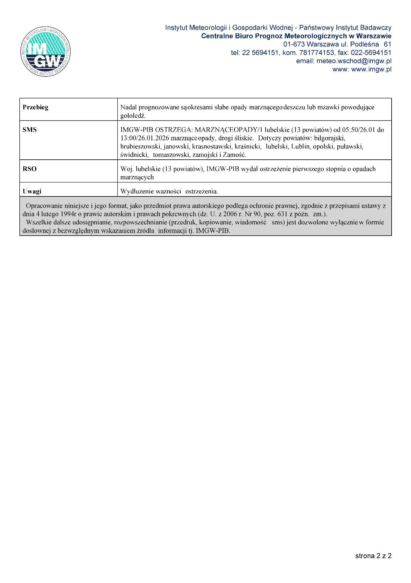 Uwagi Wydłużenie ważności ostrzeżenia. Możliwe dalsze aktualizacje ostrzeżenia.