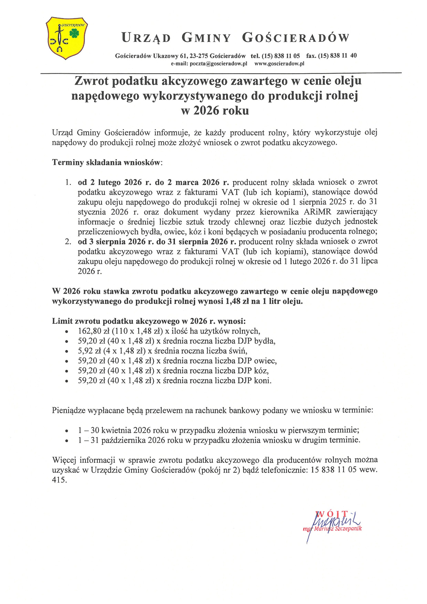 Więcej informacji w sprawie zwrotu podatku akcyzowego dla producentów rolnych można uzyskać w Urzędzie Gminy Gościeradów (pokój nr 2) bądź telefonicznie: 15 838 11 05 wew. 415.