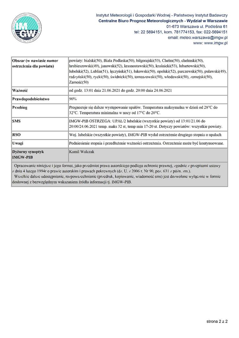 SMS IMGW-PIB OSTRZEGA: UPAŁ/2 lubelskie (wszystkie powiaty) od 13:01/21.06 do 20:00/24.06.2021 temp. maks 32 st, temp min 17-20 st. Dotyczy powiatów: wszystkie powiaty.