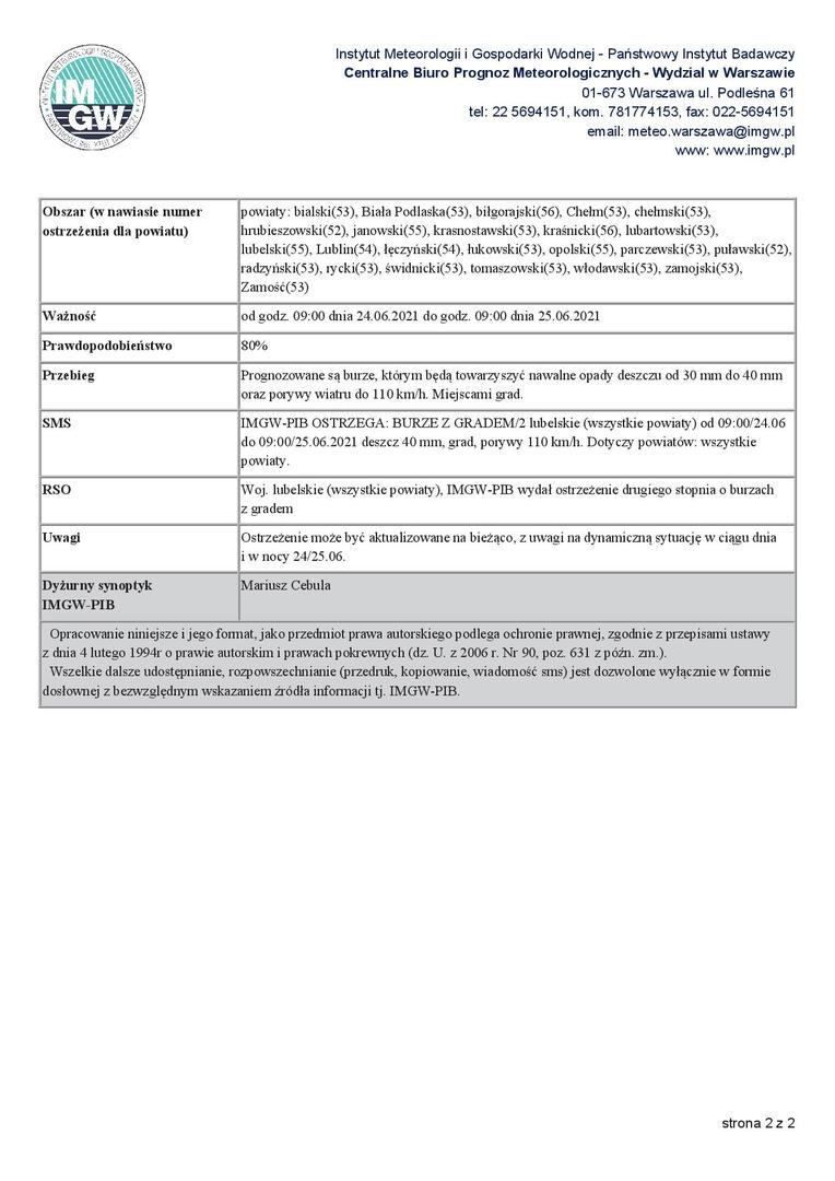 do 09:00/25.06.2021 deszcz 40 mm, grad, porywy 110 km/h. Dotyczy powiatów: wszystkie