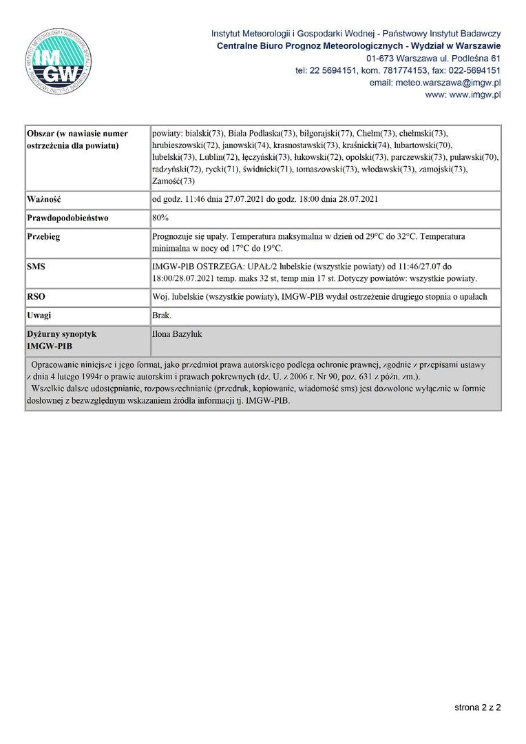 SMS IMGW-PIB OSTRZEGA: UPAŁ/2 lubelskie (wszystkie powiaty) od 11:46/27.07 do 18:00/28.07.2021 temp. maks 32 st, temp min 17 st. Dotyczy powiatów: wszystkie powiaty.