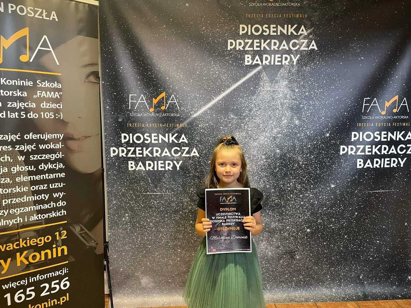 W dniu 8 października br. dostała się do finału 3 edycji Festiwalu ,,Piosenka przekracza bariery” w kategorii I (od 3 do 10 lat). W skład jury zasiedli m. in.: Monika Urlik, Kuba Jurzyk i Małgorzata Szarek (trenerka z Szansy na Sukces).