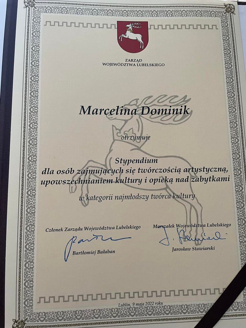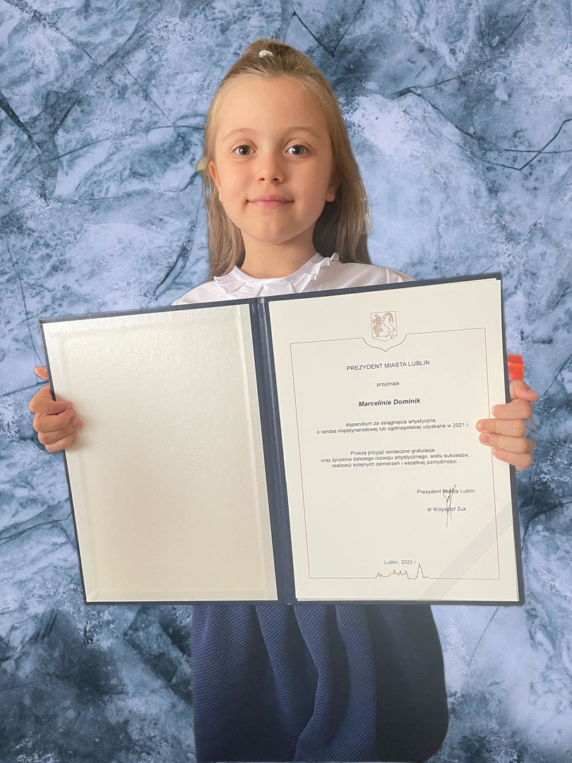 Marcelina do swoich osiągnięć może także zaliczyć dwukrotne otrzymanie Stypendium Marszałka Województwa Lubelskiego za sukcesy artystyczne.
