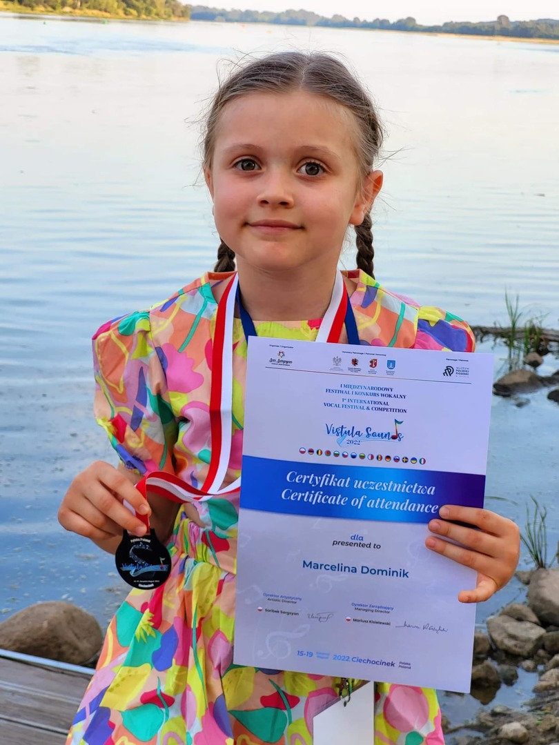 W dniach 15-19 sierpnia br. Marcelina Dominik wzięła udział w 5-cio dniowym Międzynarodowym Festiwalu w Ciechocinku otrzymując Medal Vistula Sounds i Certyfikat uczestnictwa oraz nagrody rzeczowe.