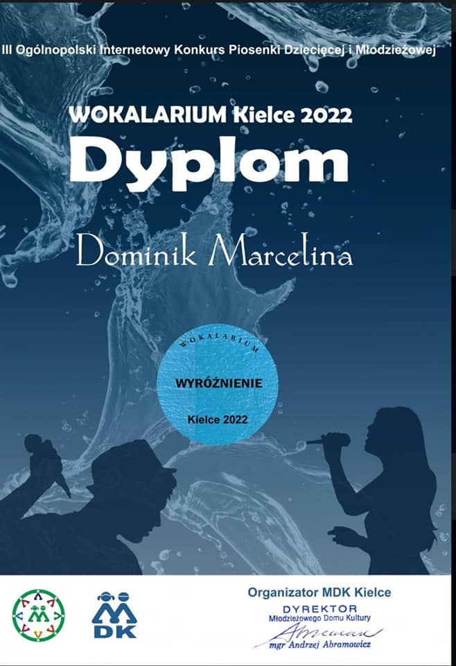W czerwcu br. Marcelina otrzymała wyróżnienie w III Ogólnopolskim internetowym Konkursie Piosenki Dziecięcej i Młodzieżowej ,,Wokalarium” w Kielcach.