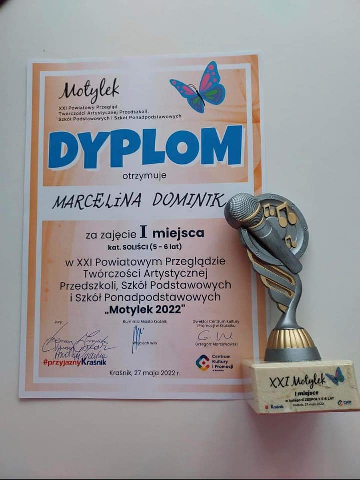 W dniu 27 maja br. Marcelina Dominik śpiewając utwór ,,Cały świat” zajęła I miejsce w XXI Powiatowym Przeglądzie Twórczości Artystycznej Przedszkoli, Szkół Podstawowych i Szkół Ponadpodstawowych ,,Motylek 2022”, który odbył się w Centrum Kultury i Promocji w Kraśniku.