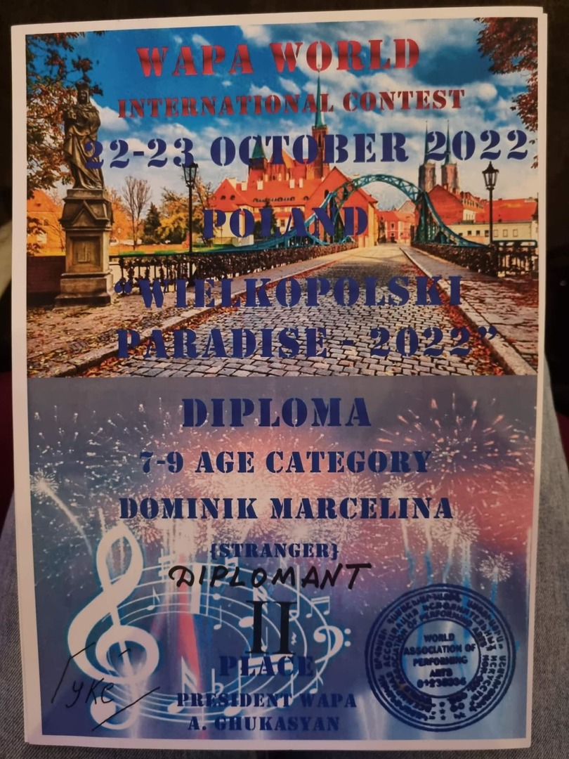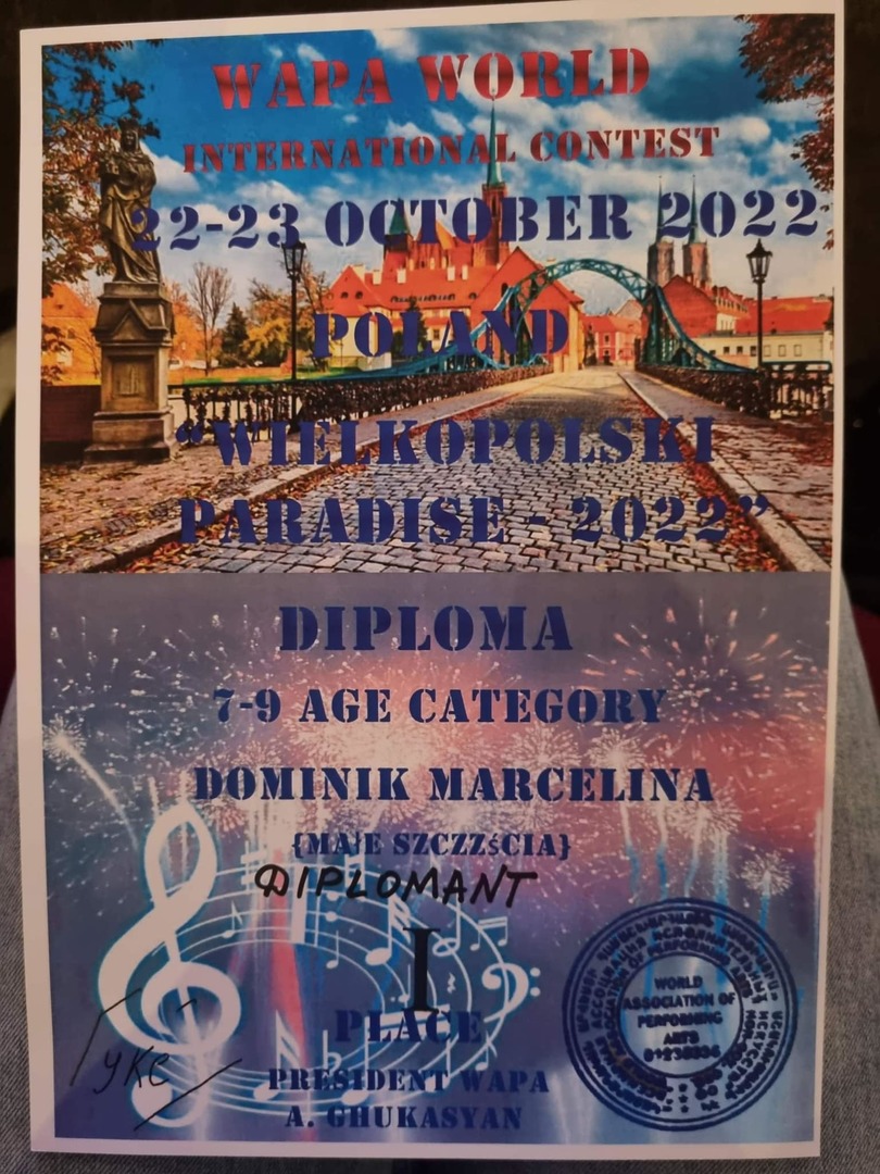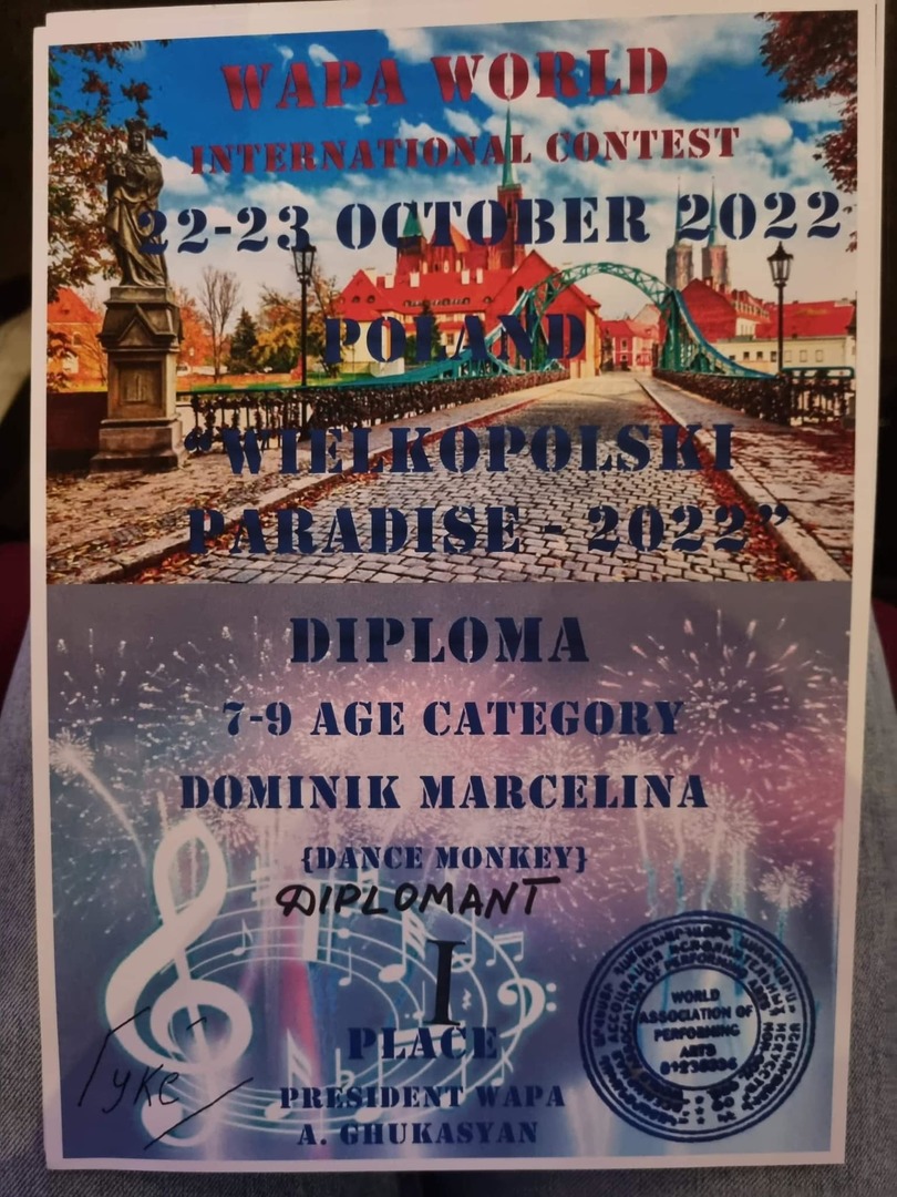 W dniach 22-23 października br. Marcelina Dominik osiągnęła ogromny sukces w Międzynarodowym Festiwalu ,,Wielkopolski Paradise” w Ostrowie Wielkopolskim. Marcelina wzięła udział w trzech kategoriach, w każdej osiągnęła sukces.