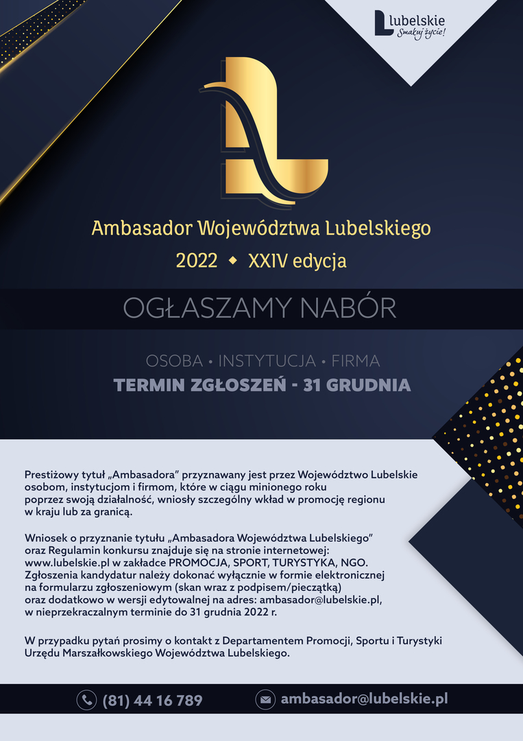 miło nam poinformować, że Departament Promocji, Sportu i Turystyki UMWL ogłasza rozpoczęcie XXIV edycji konkursu Ambasador Województwa Lubelskiego.