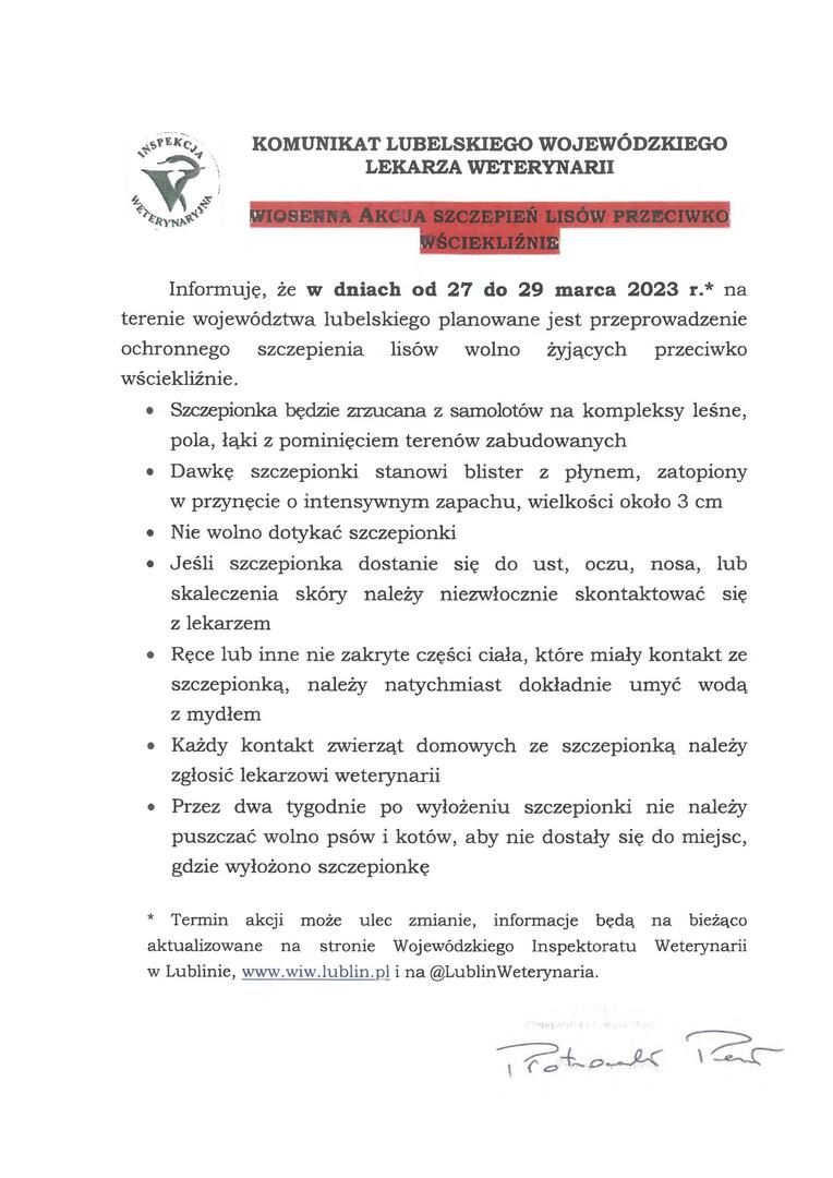 Informuję, że w dniach od 27 do 29 marca 2023 r.* na terenie województwa lubelskiego planowane jest przeprowadzenie ochronnego szczepienia lisów wolno źyjących przeciwko wściekliźnie.