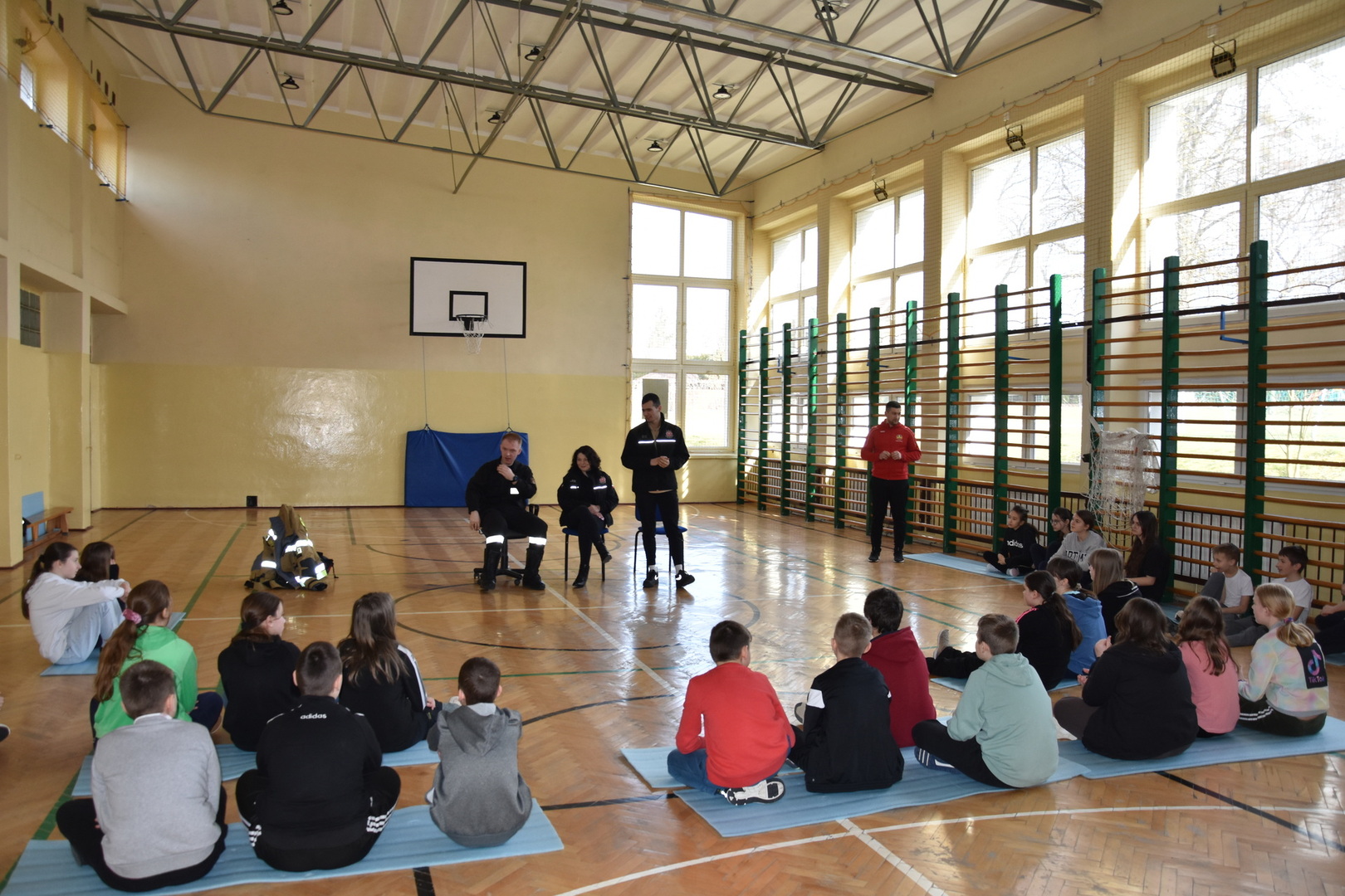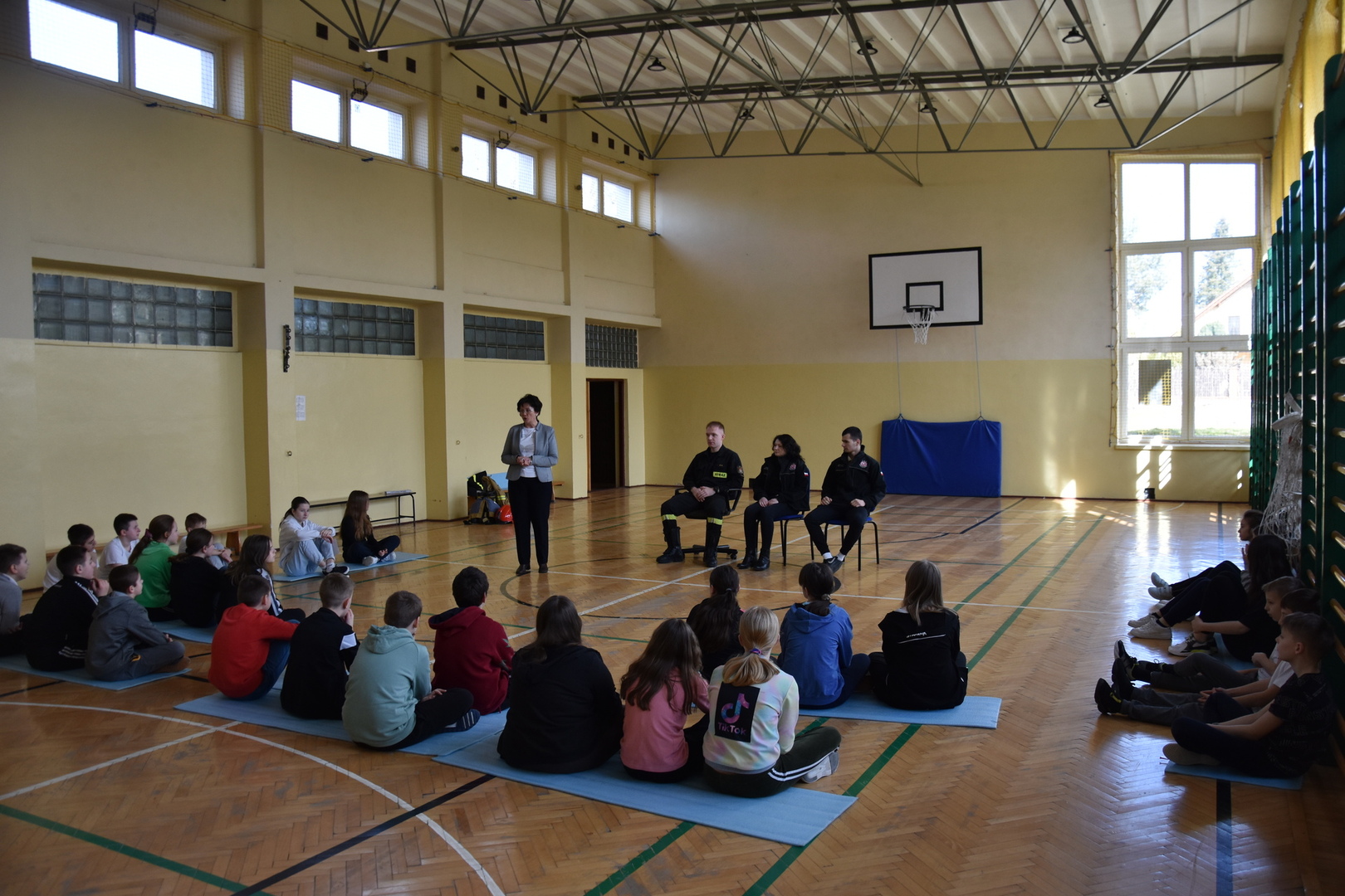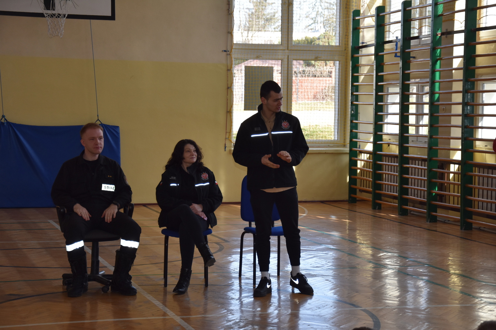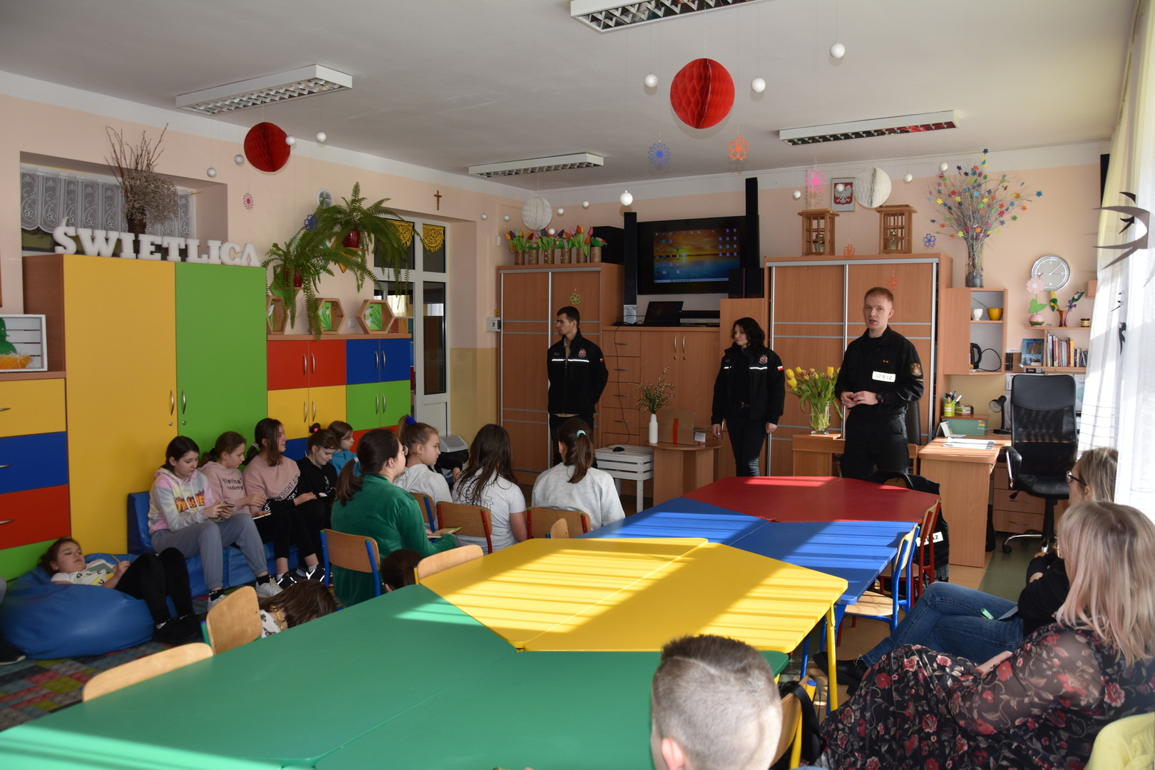 Fotorelacja ze spotkania w Zespole Placówek Oświatowych im. Jana Pawła II w Gościeradowie dotyczącego promowania bezpieczeństwa pozwalającego na zwiększenie świadomosci i odpowiedzialnych zachowań przy udziale instytucji: Komendy Powiatowej Policji w Kraśniku, Komisariatu Policji w Annopolu, Komendy Powiatowej Państwowej Straży Pożarnej w Kraśniku oraz Ochotniczej Straży Pożarnej w Gościeradowie.