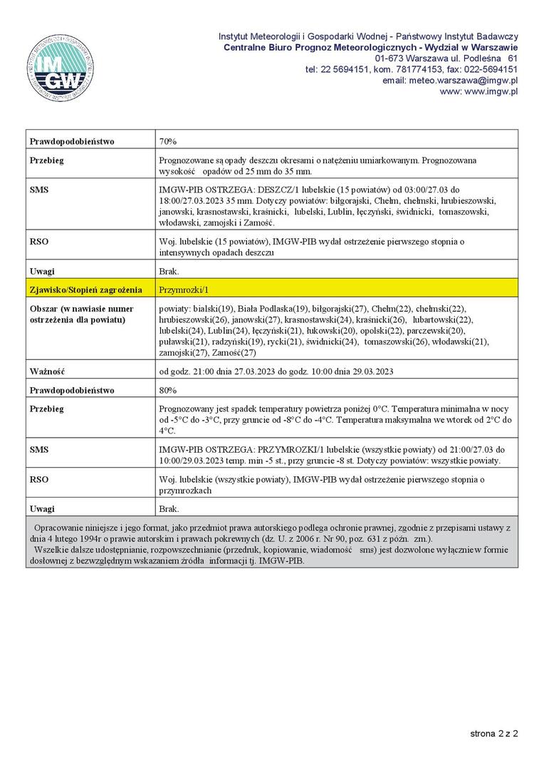 SMS IMGW-PIB OSTRZEGA: DESZCZ/1 lubelskie (15 powiatów) od 03:00/27.03 do 18:00/27.03.2023 35 mm. Dotyczy powiatów: biłgorajski, Chełm, chełmski, hrubieszowski,