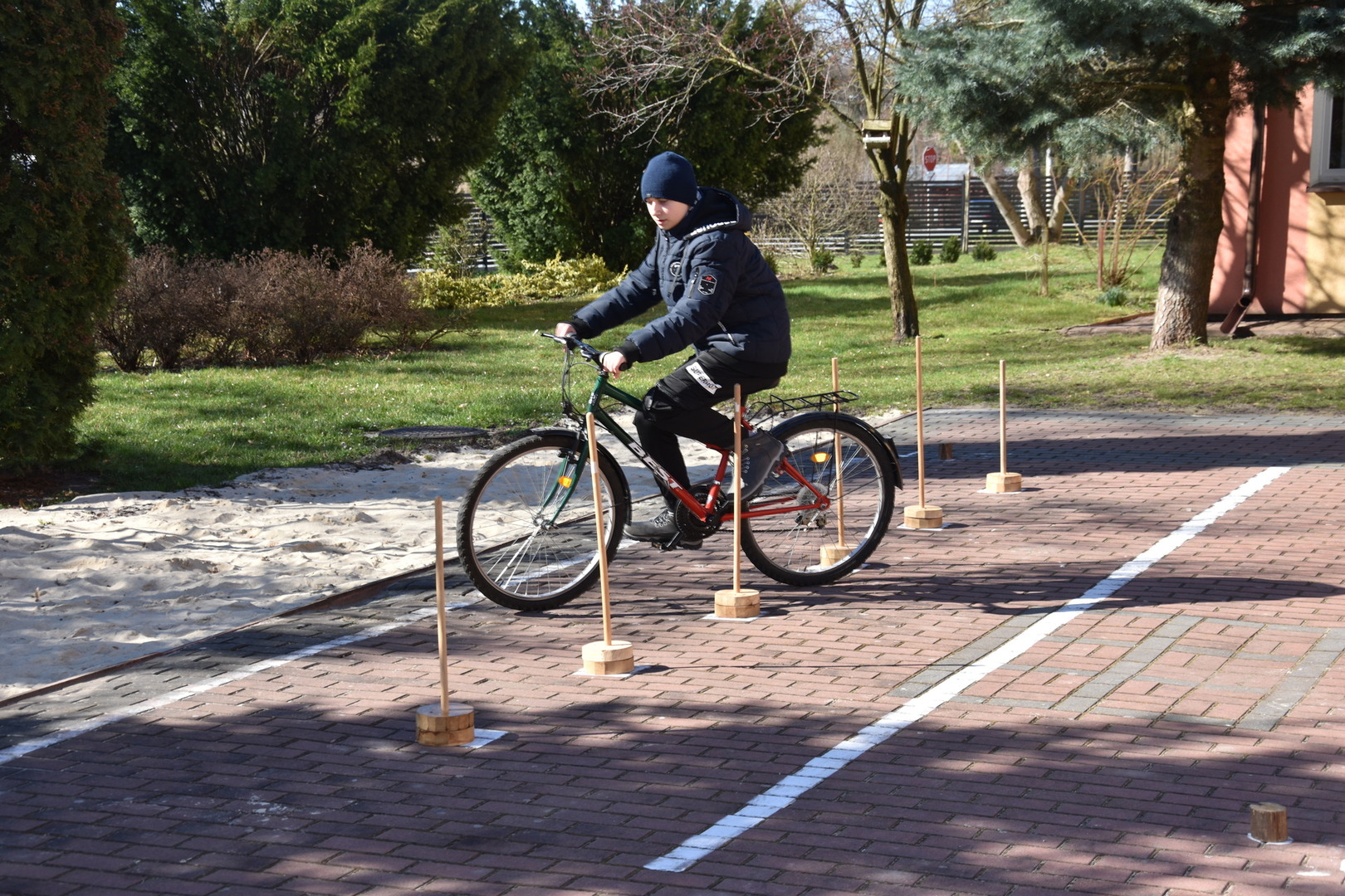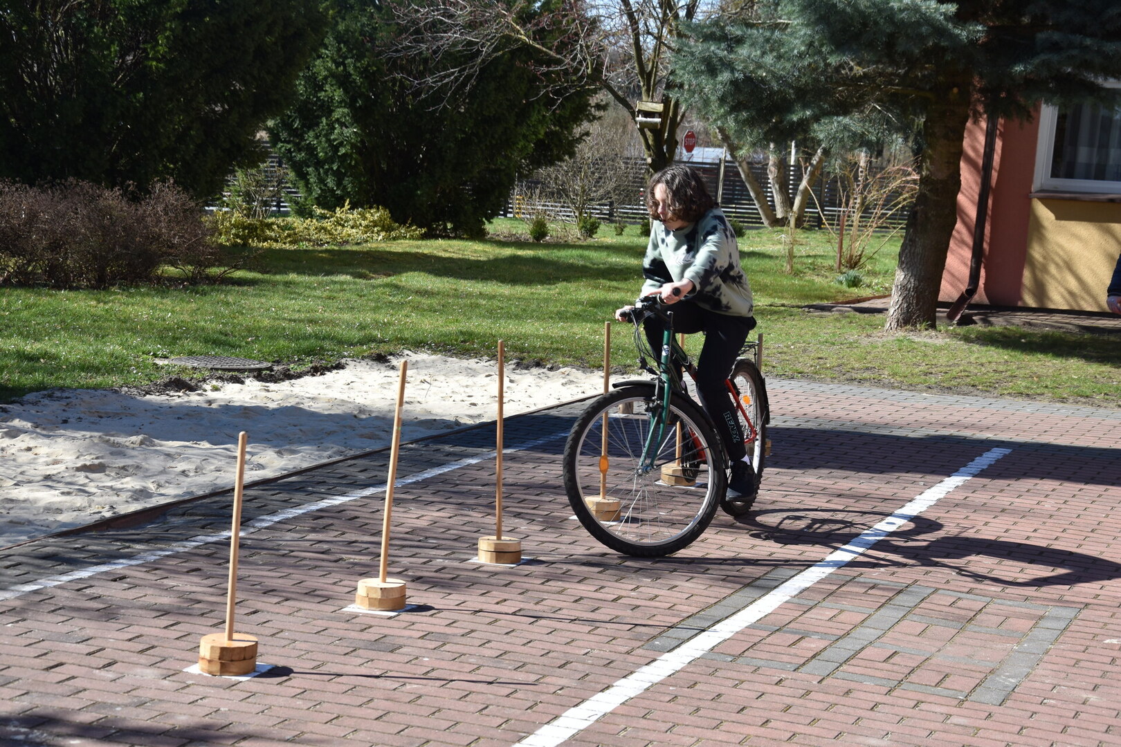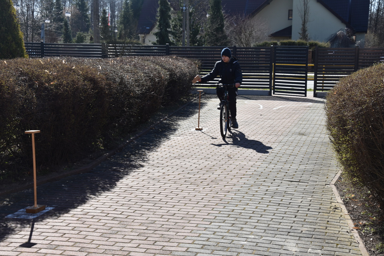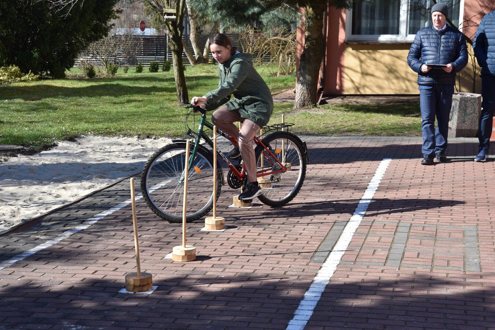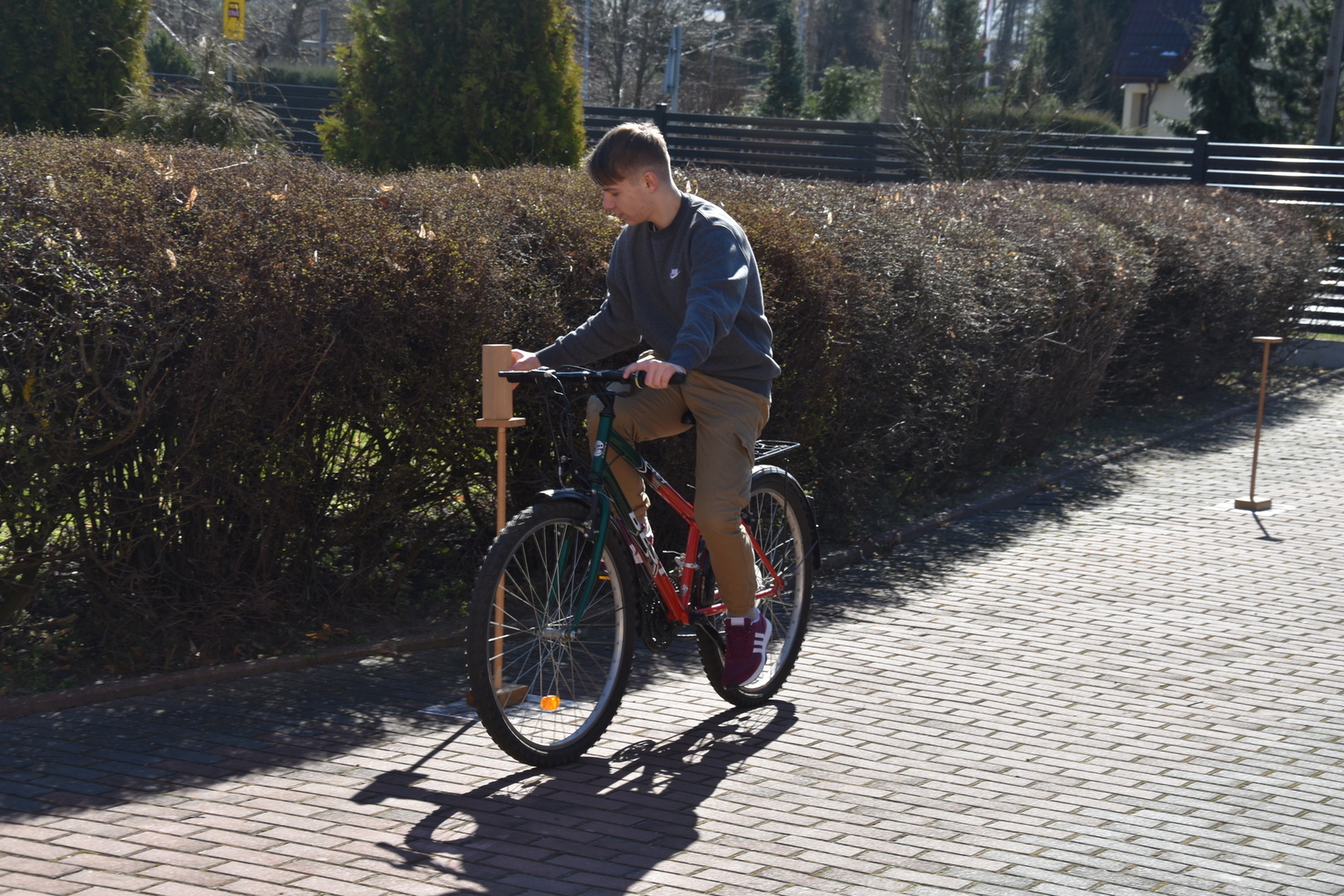 - praktyczna, czyli jazda sprawnościowa rowerem po torze przeszkód (slalom pomiędzy pachołkami,przewożenie przedmiotu, ósemka, zwężenie pomiędzy krążkami, równoważnia oraz zatrzymanie w miejscu.