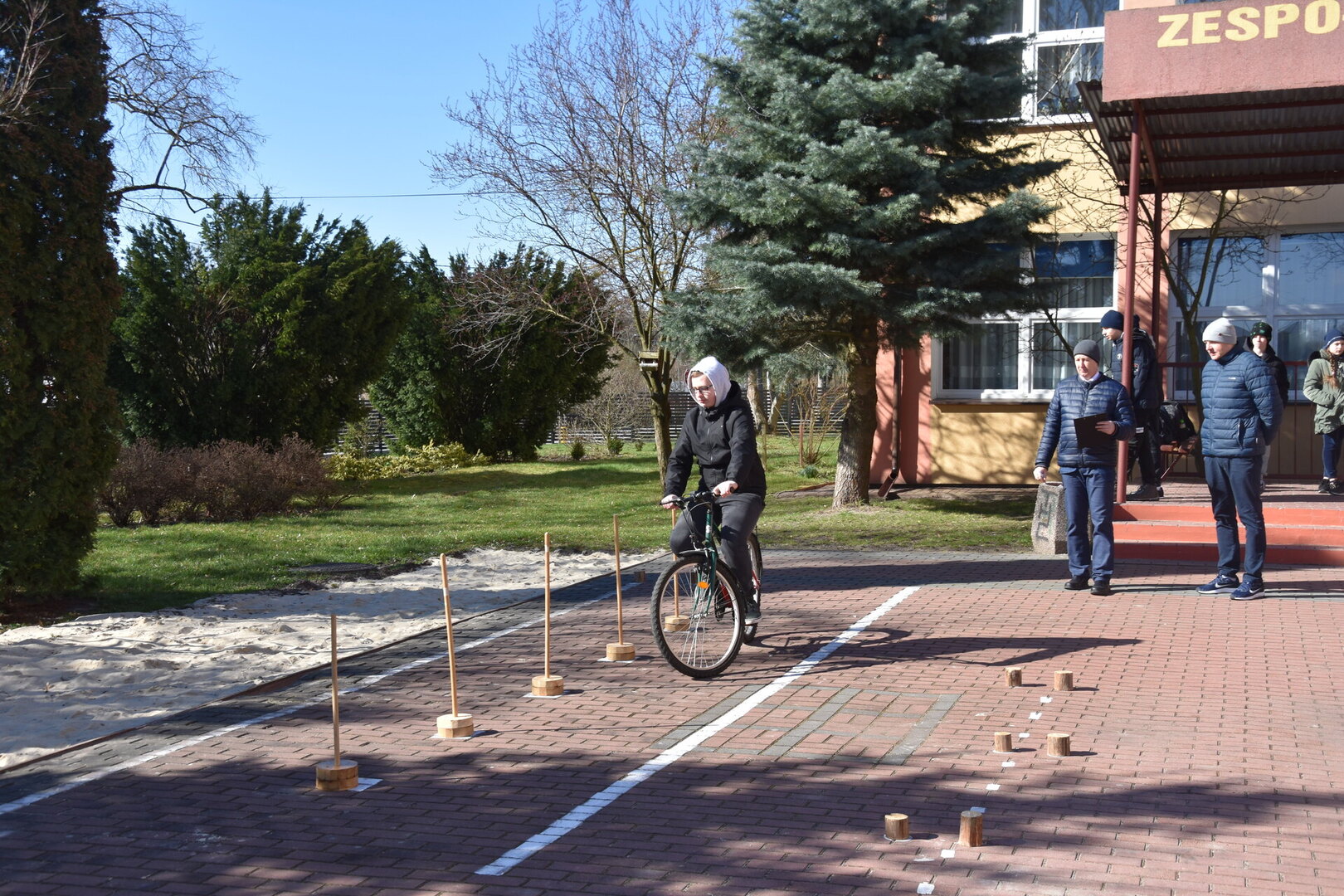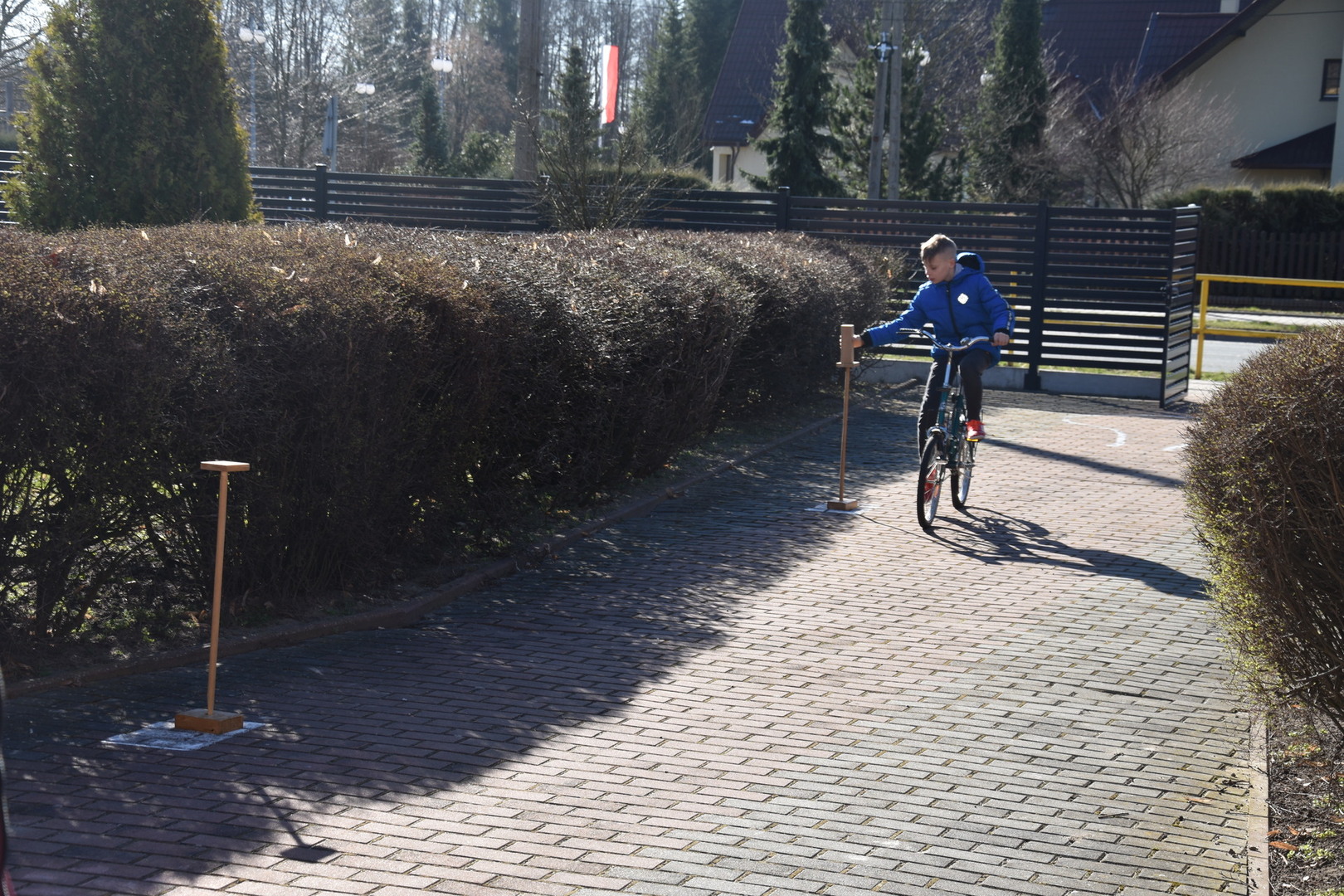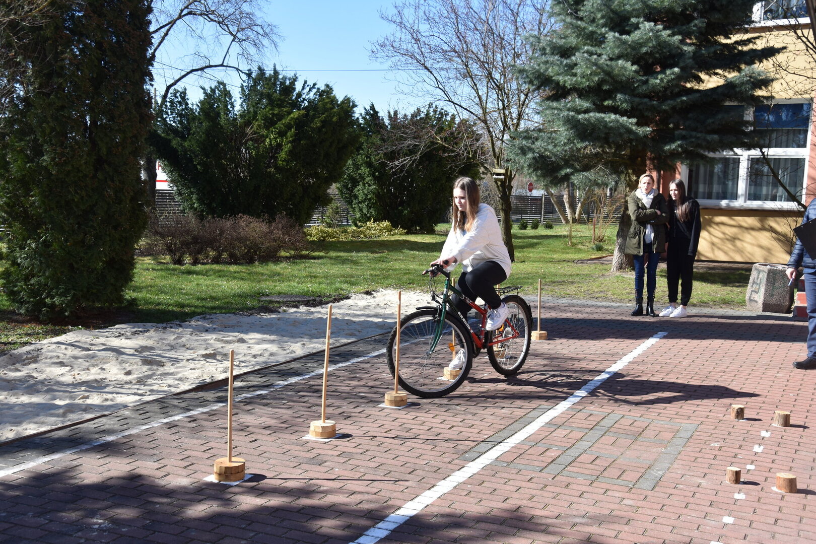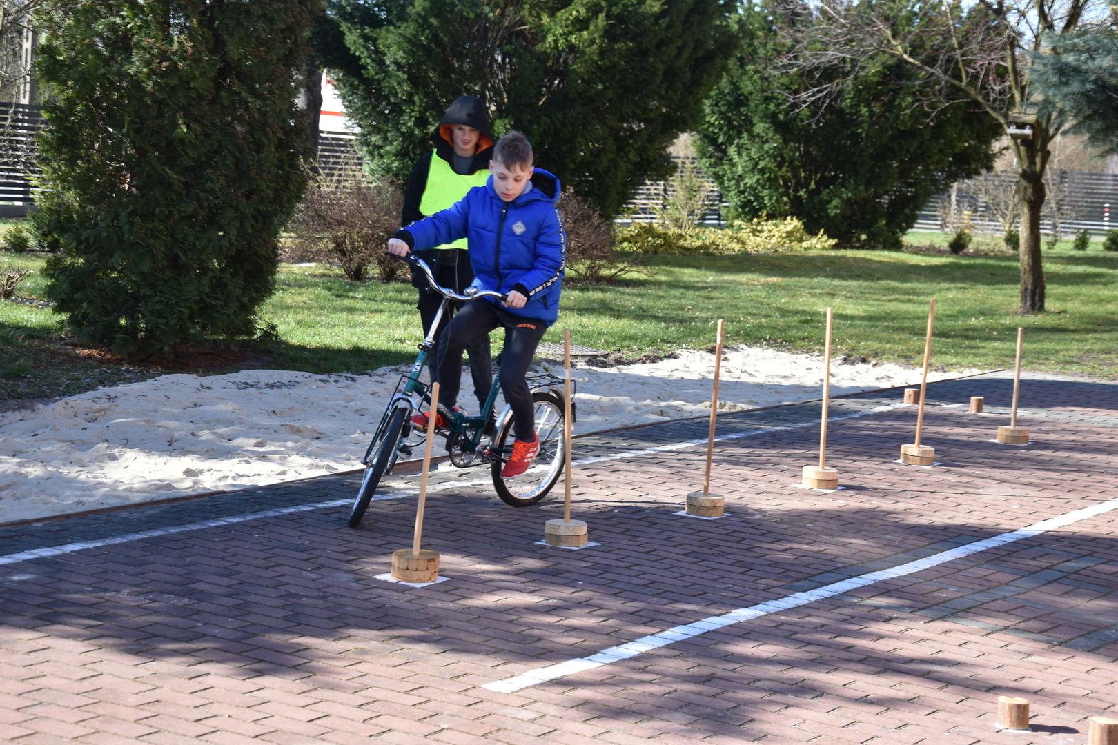 - praktyczna, czyli jazda sprawnościowa rowerem po torze przeszkód (slalom pomiędzy pachołkami,przewożenie przedmiotu, ósemka, zwężenie pomiędzy krążkami, równoważnia oraz zatrzymanie w miejscu.