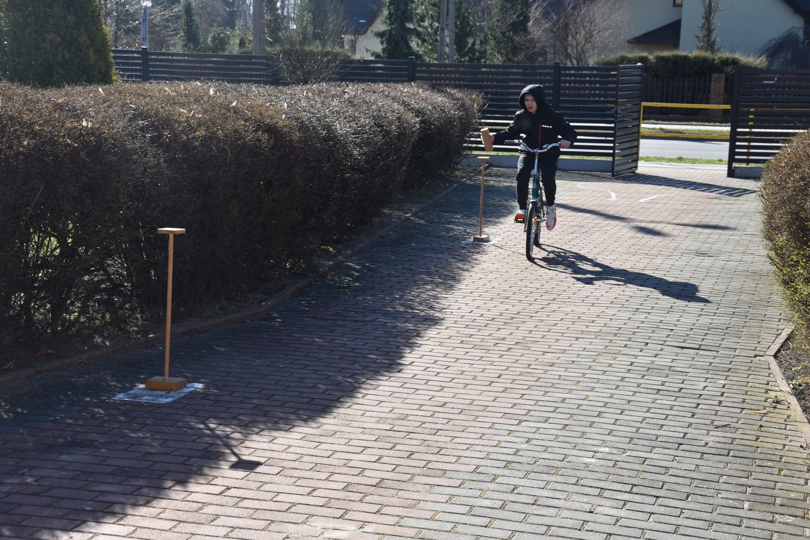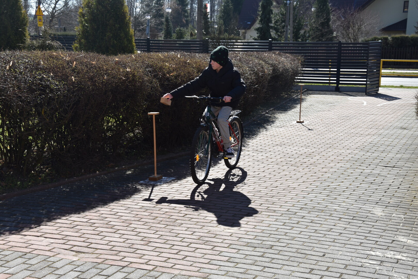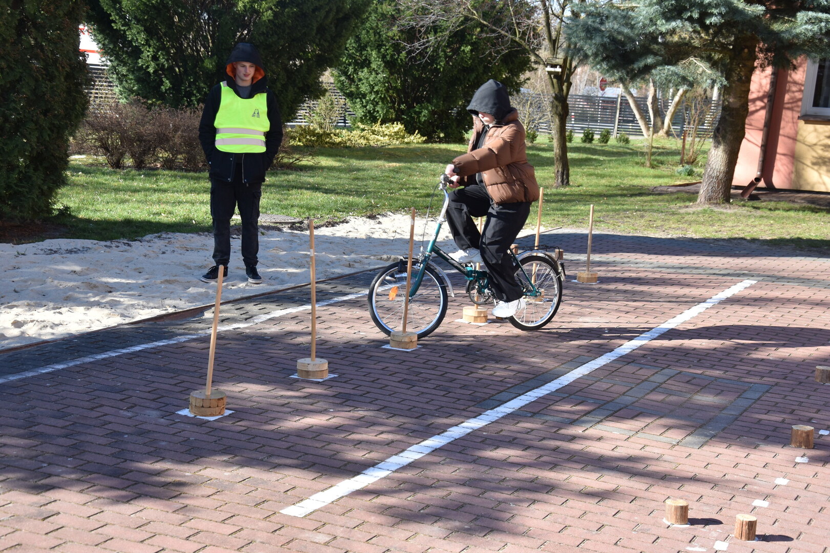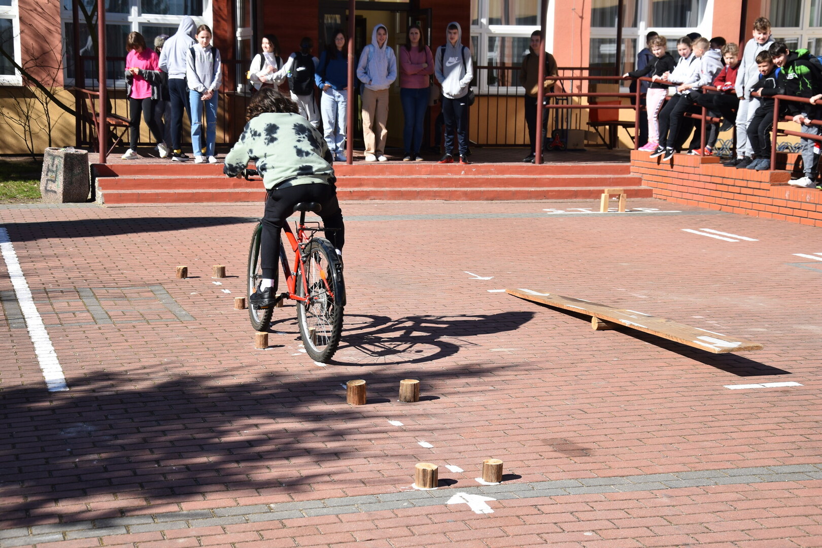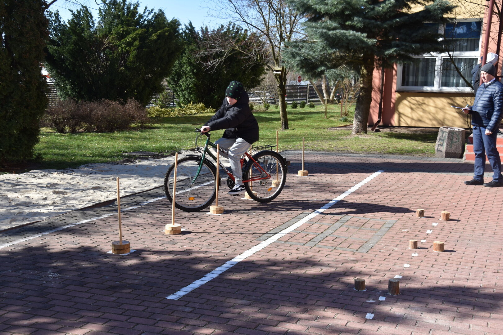 - praktyczna, czyli jazda sprawnościowa rowerem po torze przeszkód (slalom pomiędzy pachołkami,przewożenie przedmiotu, ósemka, zwężenie pomiędzy krążkami, równoważnia oraz zatrzymanie w miejscu.