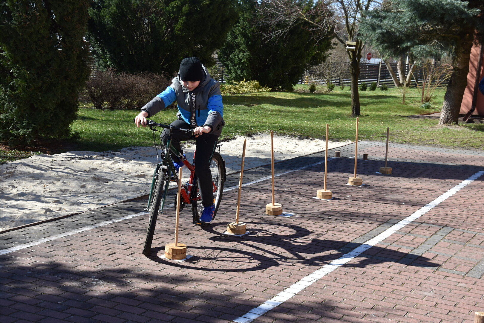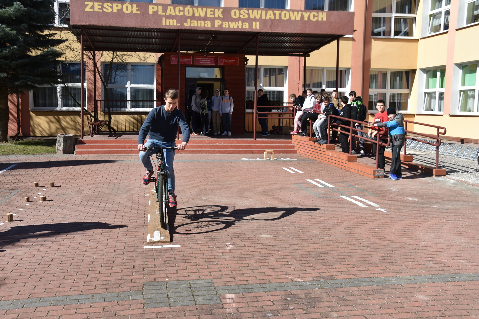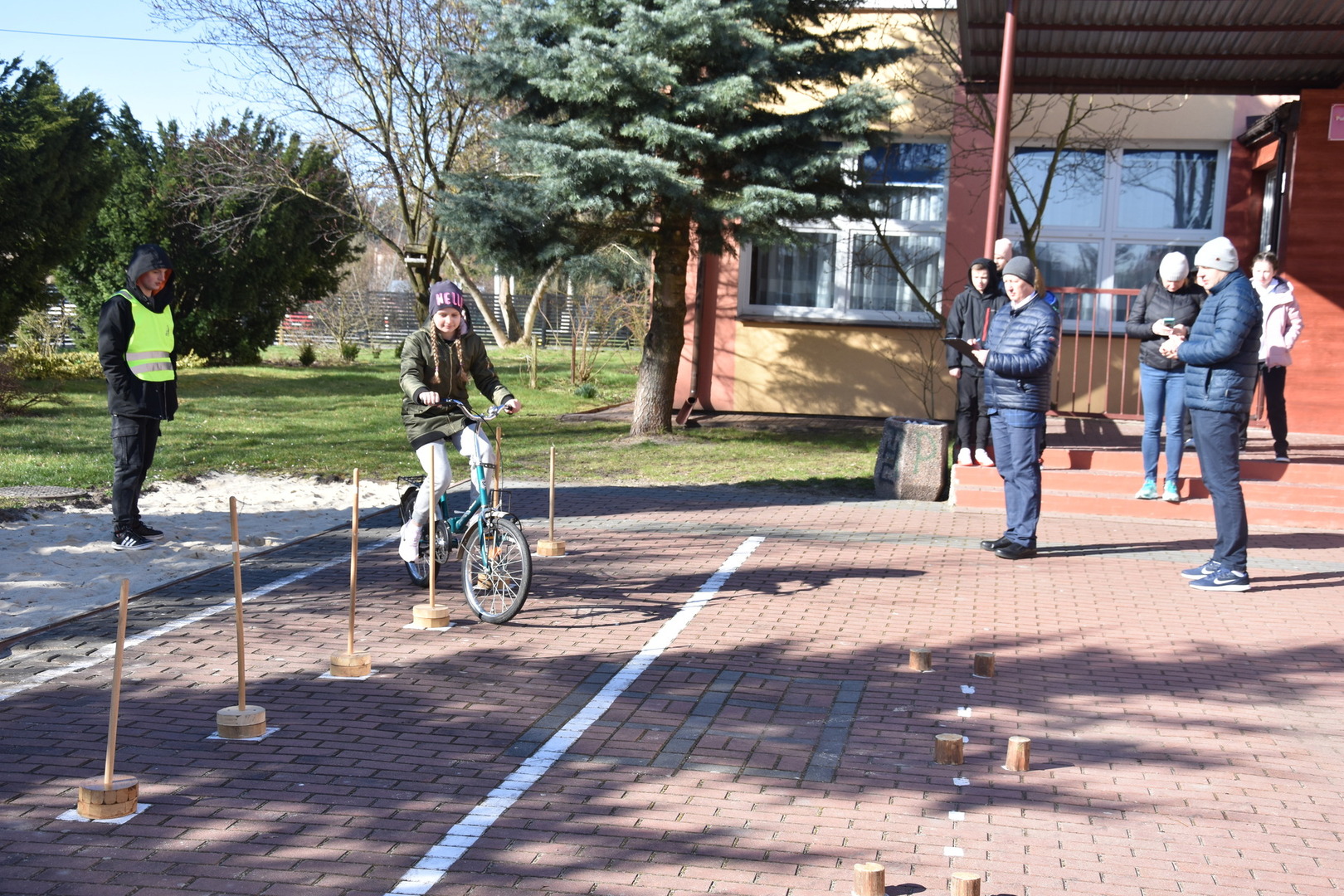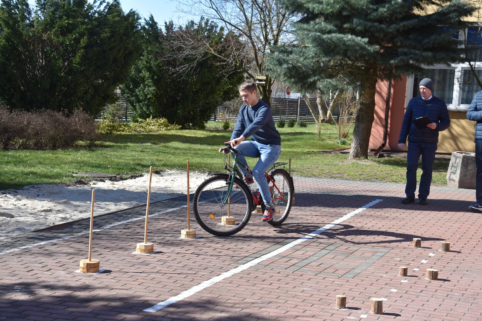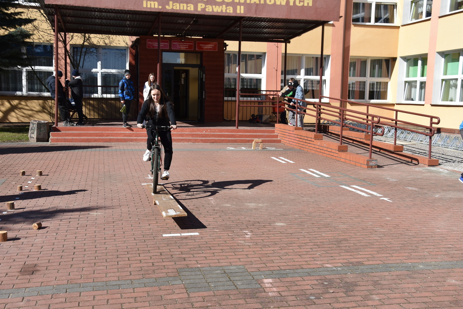 - praktyczna, czyli jazda sprawnościowa rowerem po torze przeszkód (slalom pomiędzy pachołkami,przewożenie przedmiotu, ósemka, zwężenie pomiędzy krążkami, równoważnia oraz zatrzymanie w miejscu.