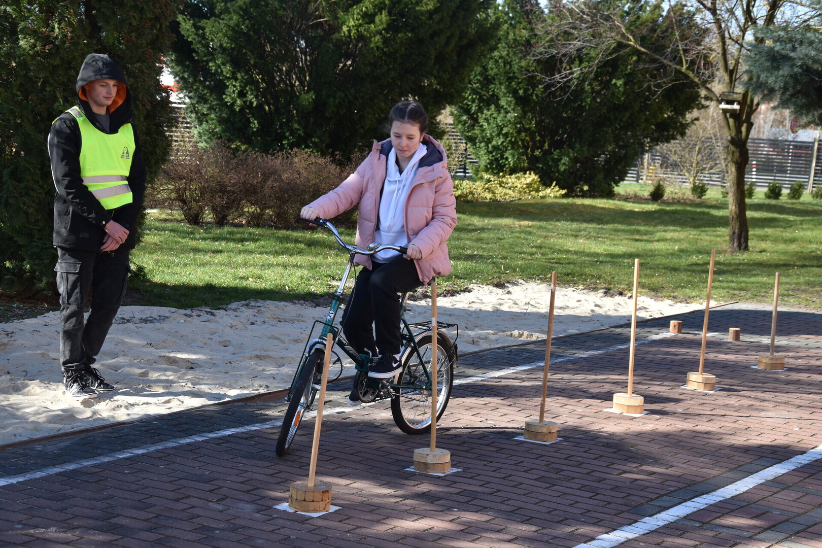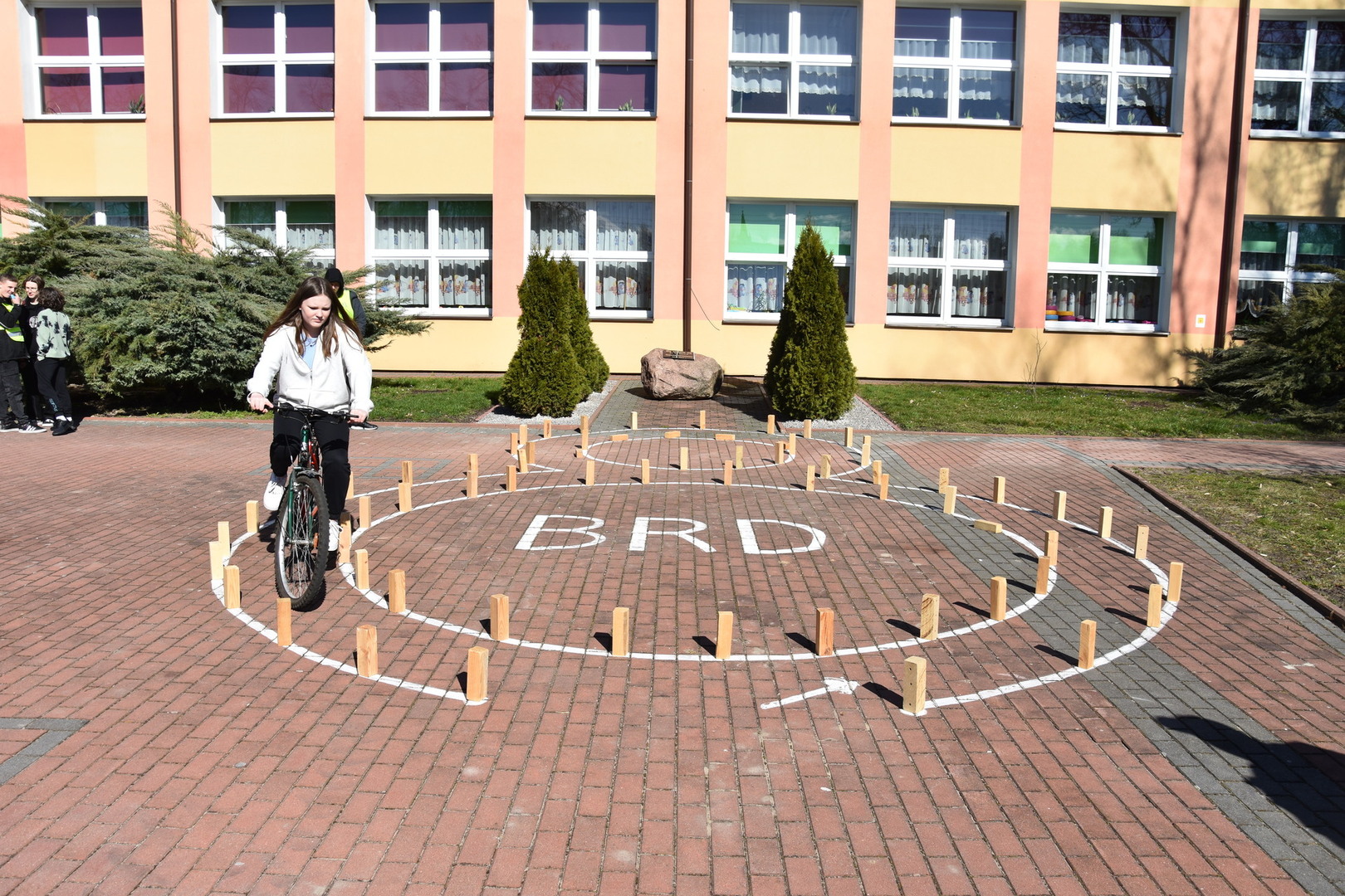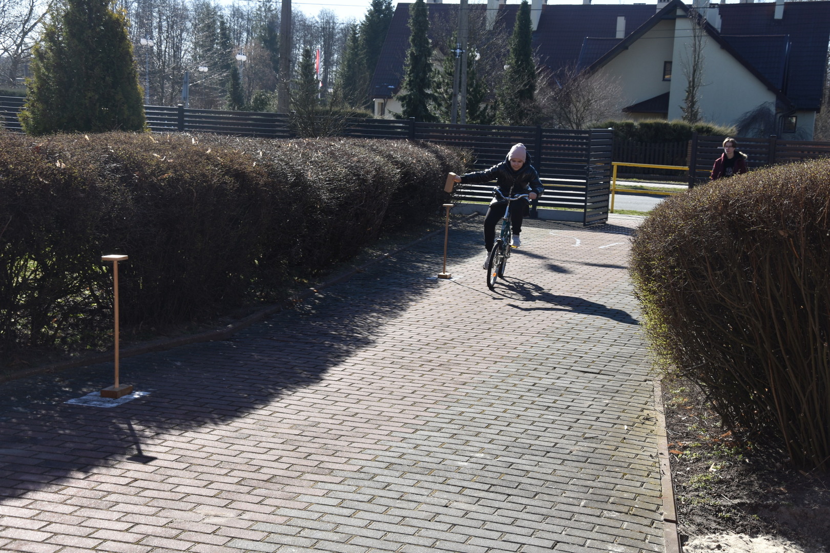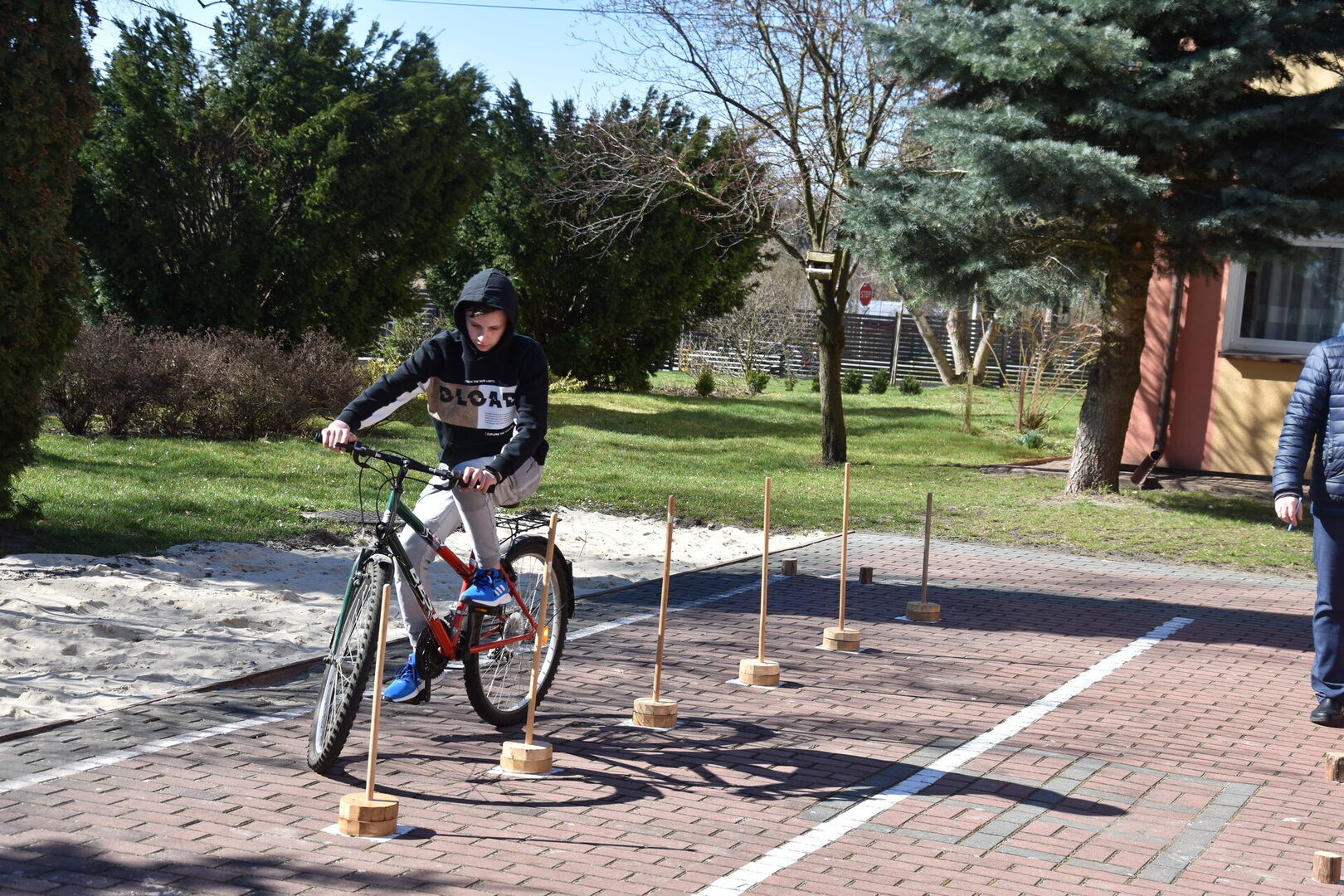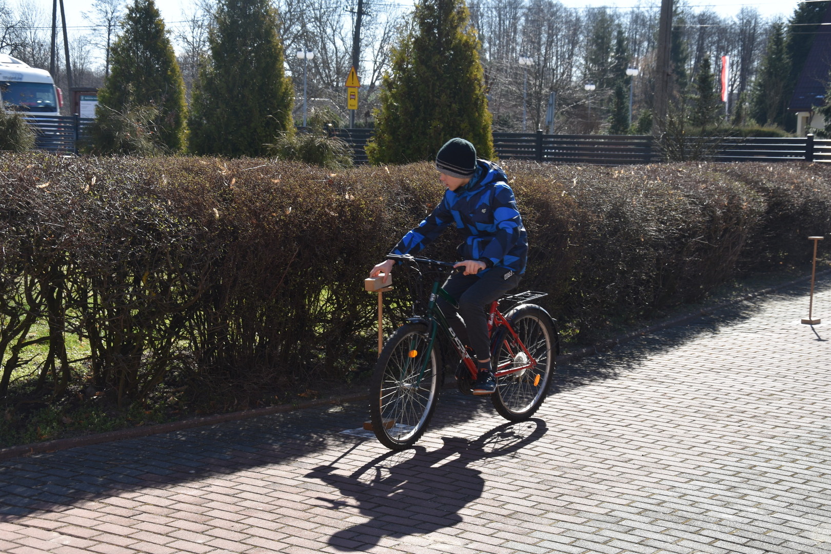 - praktyczna, czyli jazda sprawnościowa rowerem po torze przeszkód (slalom pomiędzy pachołkami,przewożenie przedmiotu, ósemka, zwężenie pomiędzy krążkami, równoważnia oraz zatrzymanie w miejscu.