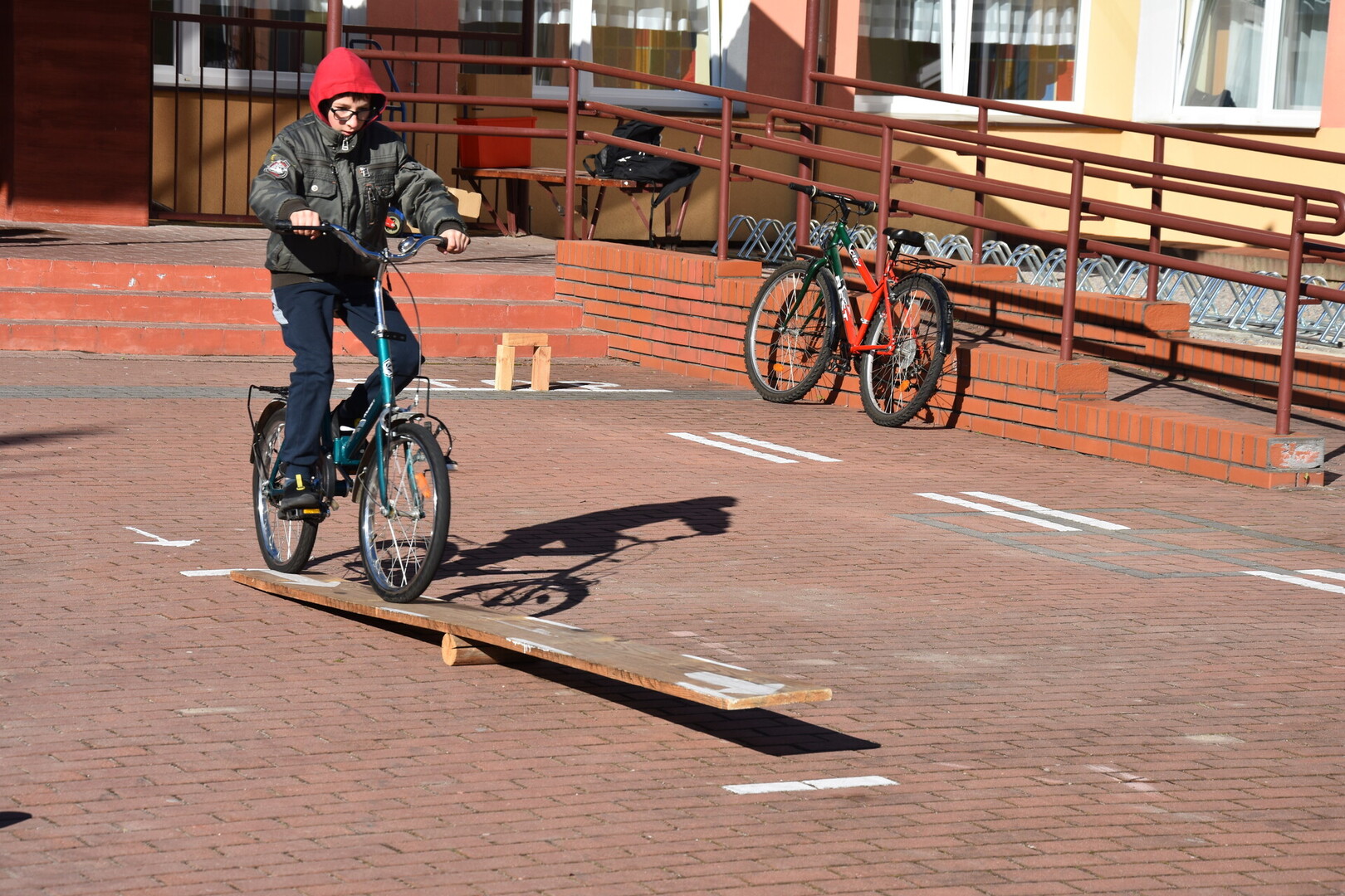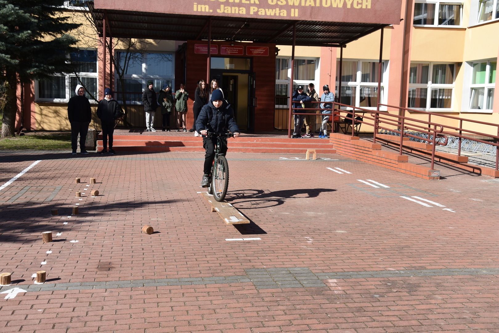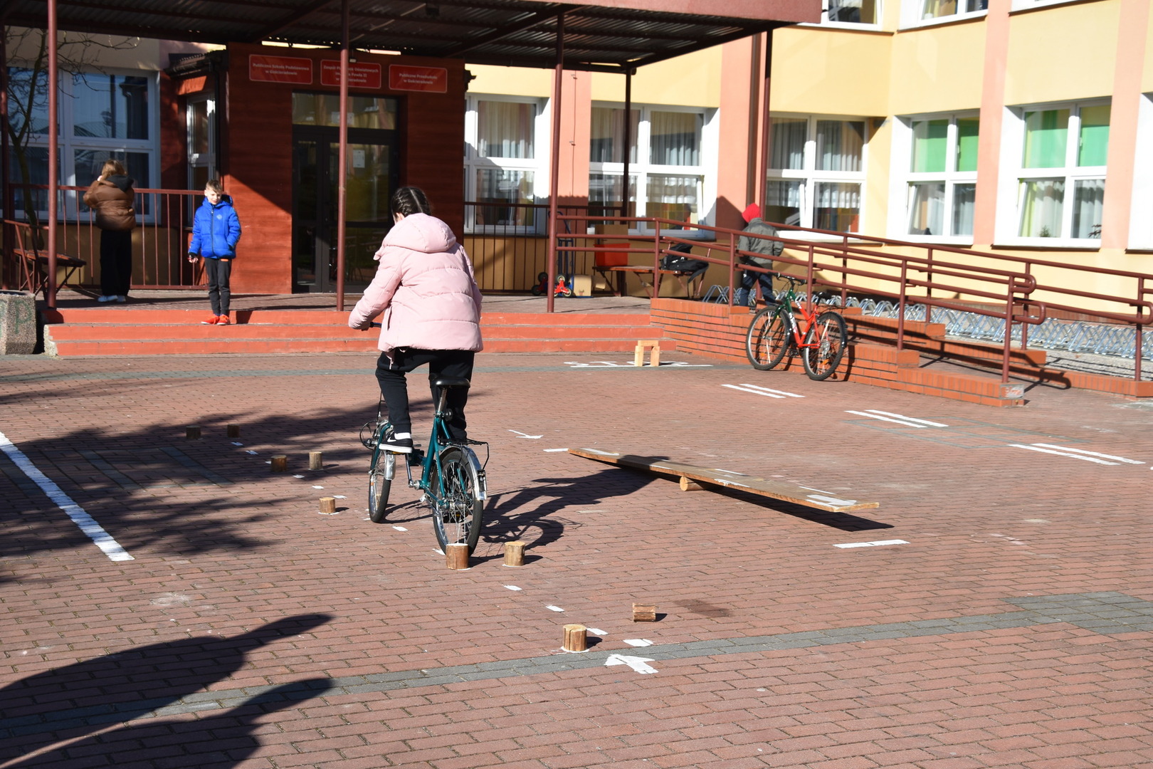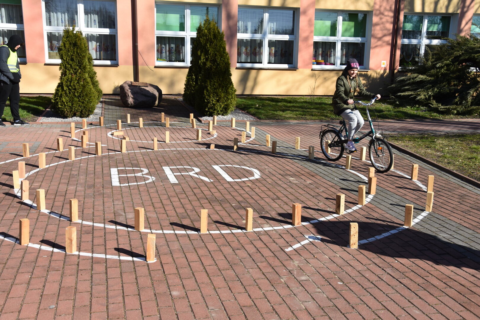 - praktyczna, czyli jazda sprawnościowa rowerem po torze przeszkód (slalom pomiędzy pachołkami,przewożenie przedmiotu, ósemka, zwężenie pomiędzy krążkami, równoważnia oraz zatrzymanie w miejscu.