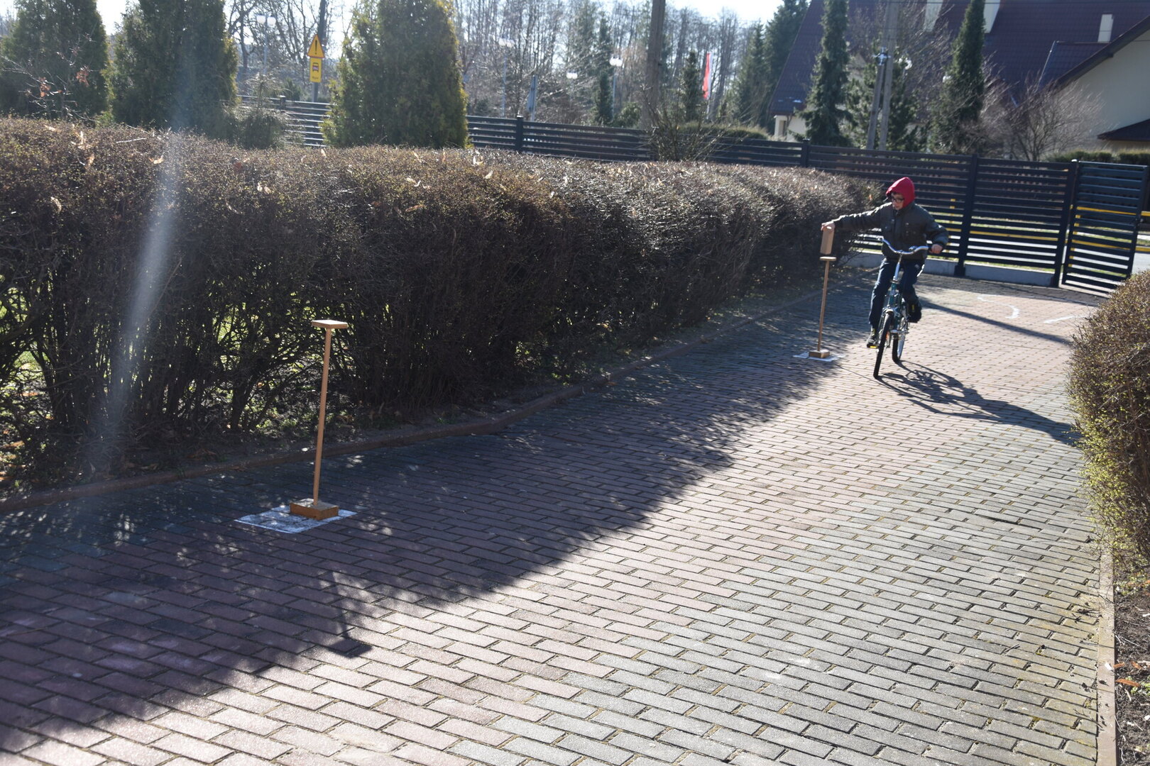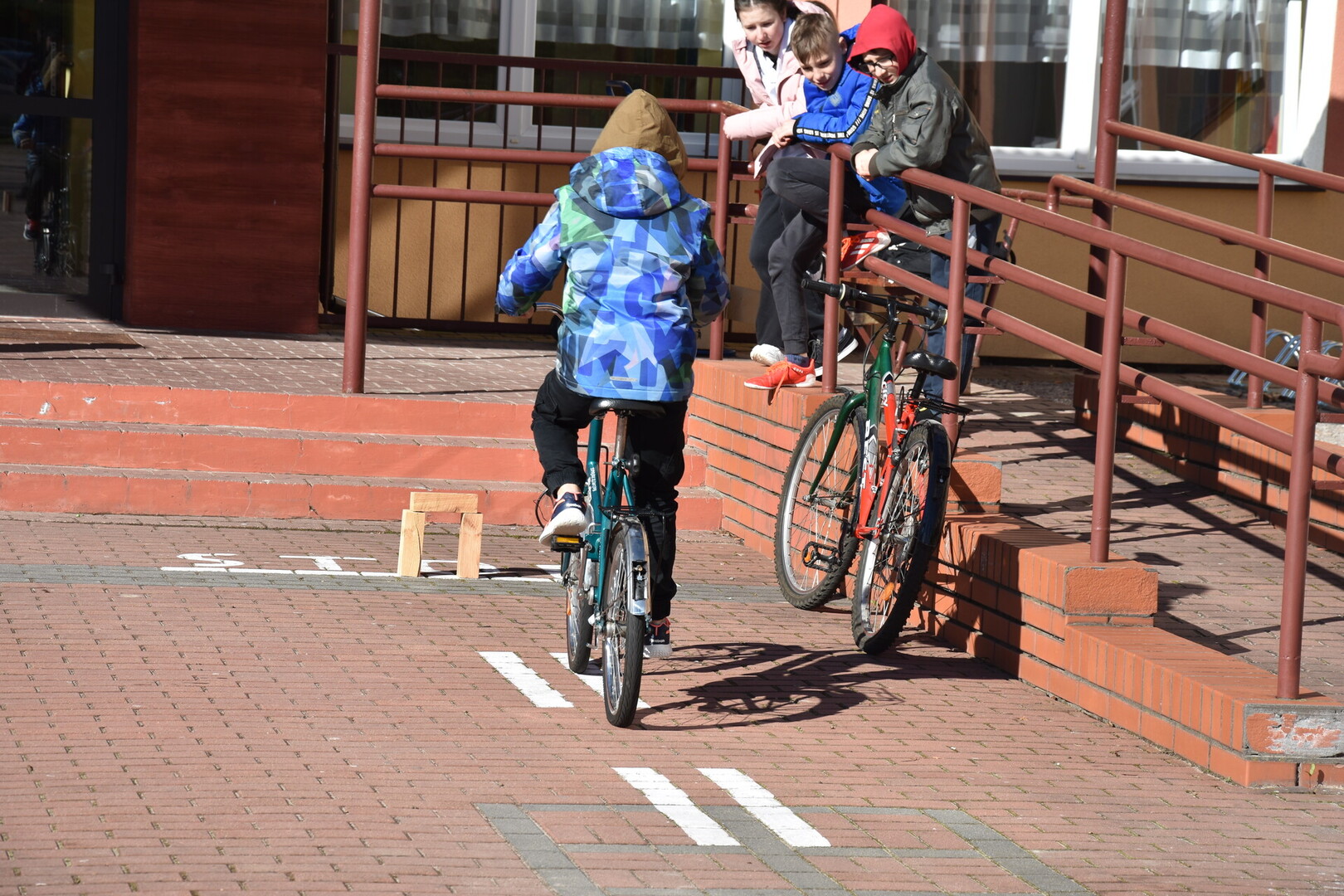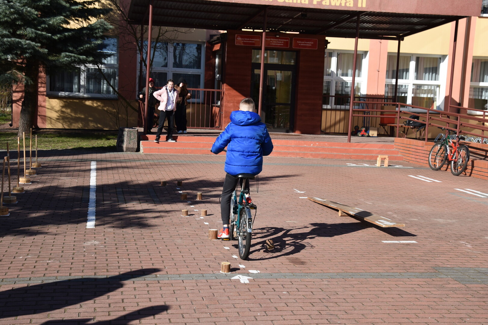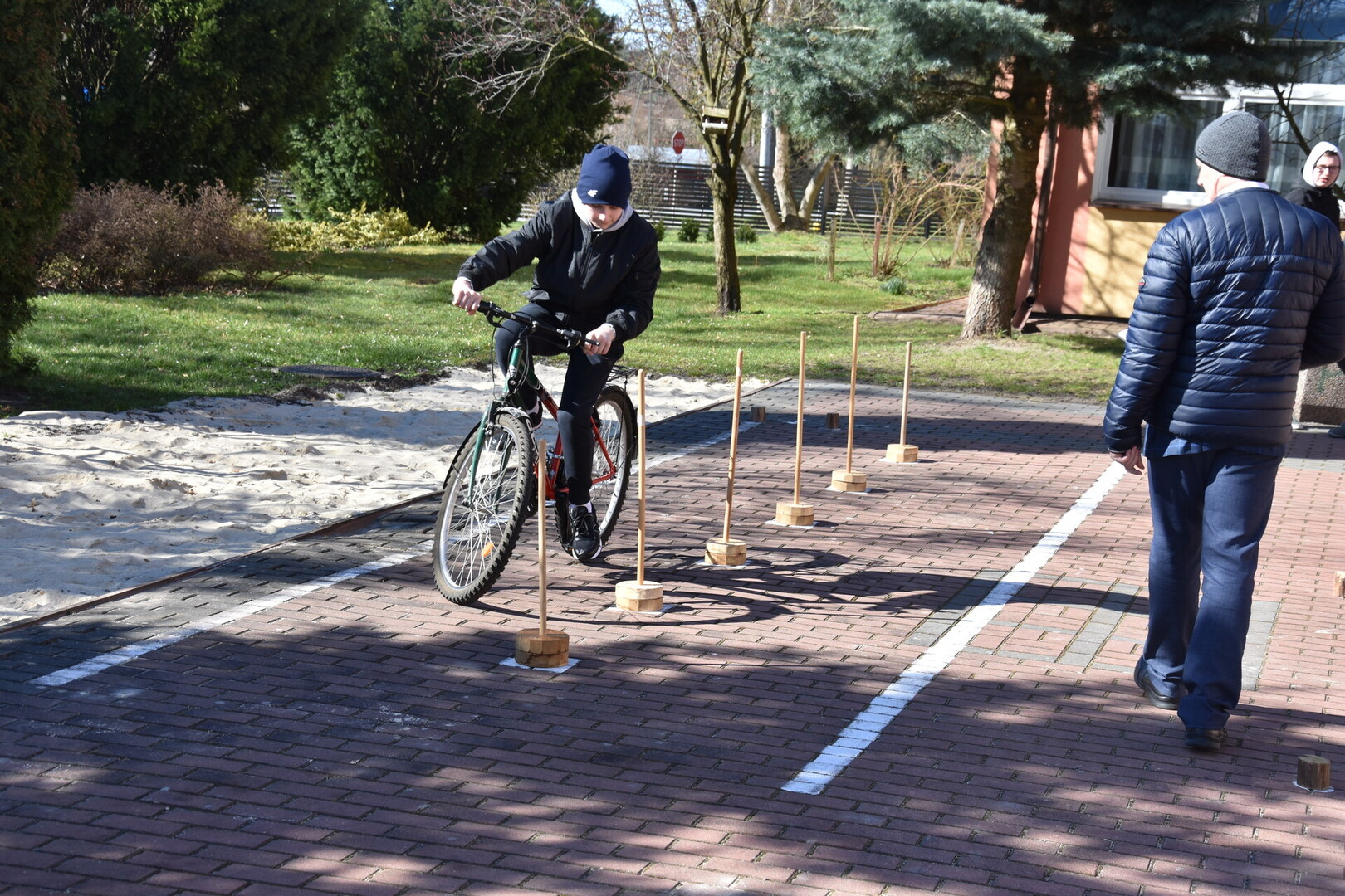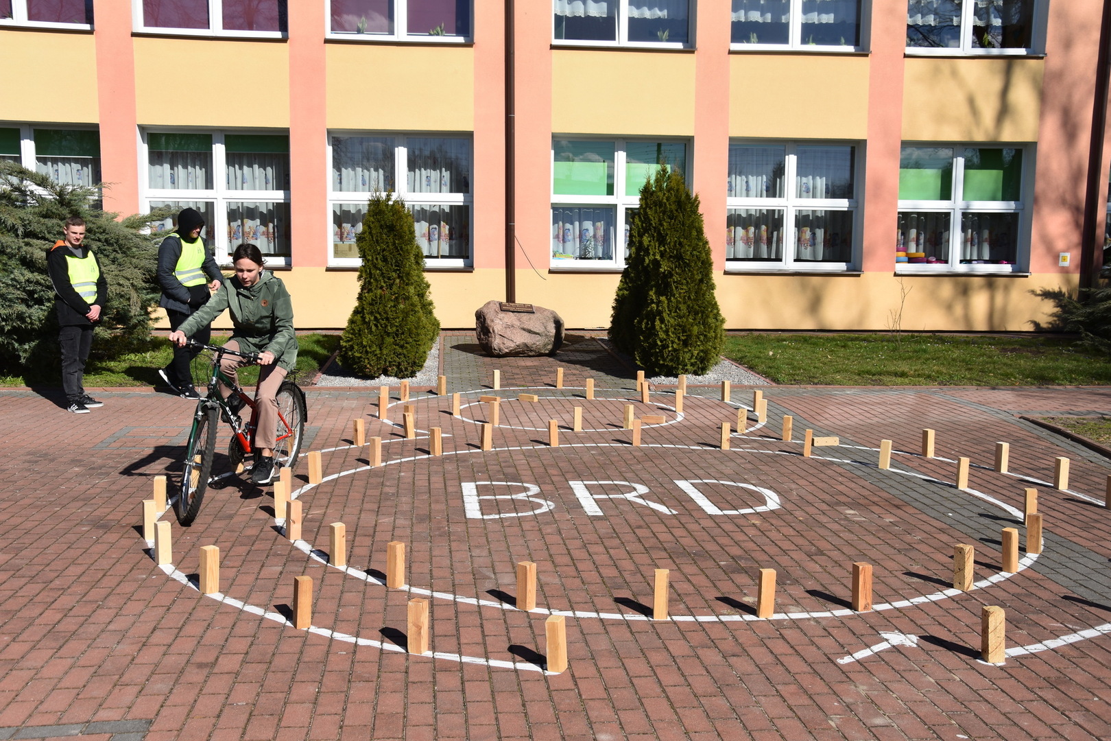 - praktyczna, czyli jazda sprawnościowa rowerem po torze przeszkód (slalom pomiędzy pachołkami,przewożenie przedmiotu, ósemka, zwężenie pomiędzy krążkami, równoważnia oraz zatrzymanie w miejscu.