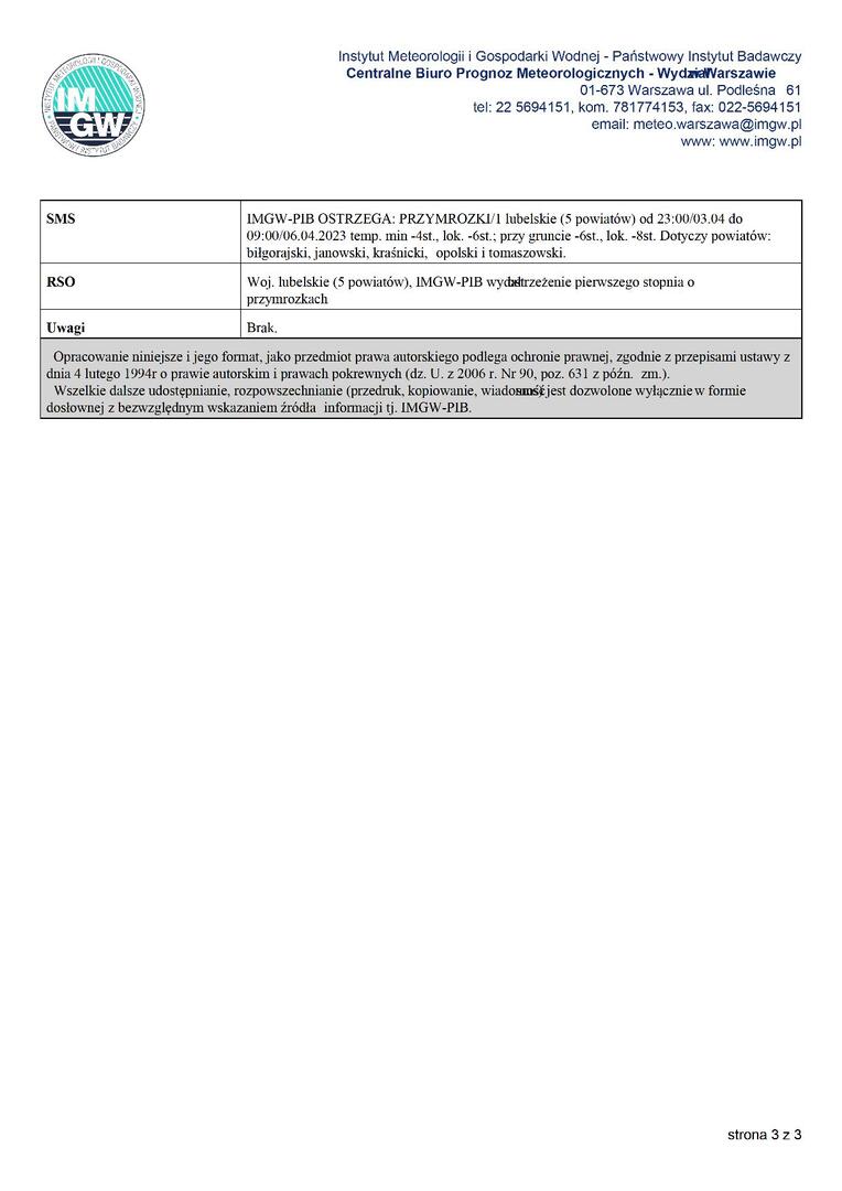 SMSIMGW-PIB OSTRZEGA: PRZYMROZKI/1 lubelskie (19 powiatów) od 22:14/04.04 do 09:00/06.04.2023 temp. min wtorek/środa -6st, przy gruncie -8st,środa/czwartek -3°C, przy gruncie -5°C. Dotyczy powiatów: bialski, Biała Podlaska, Chełm, chełmski, hrubieszowski, krasnostawski, lubartowski, lubelski, Lublin,łęczyński,łukowski, parczewski, puławski, radzyński, rycki,świdnicki, włodawski, zamojski i Zamość.