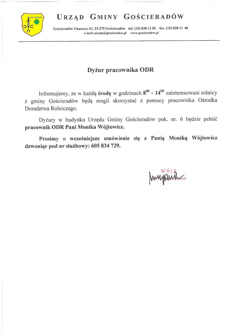 Dyżury w budynku Urzędu Gminy Gościeradów pok. nr. 6 będzie pełnić pracownik ODRPani Monika Wójtowicz.