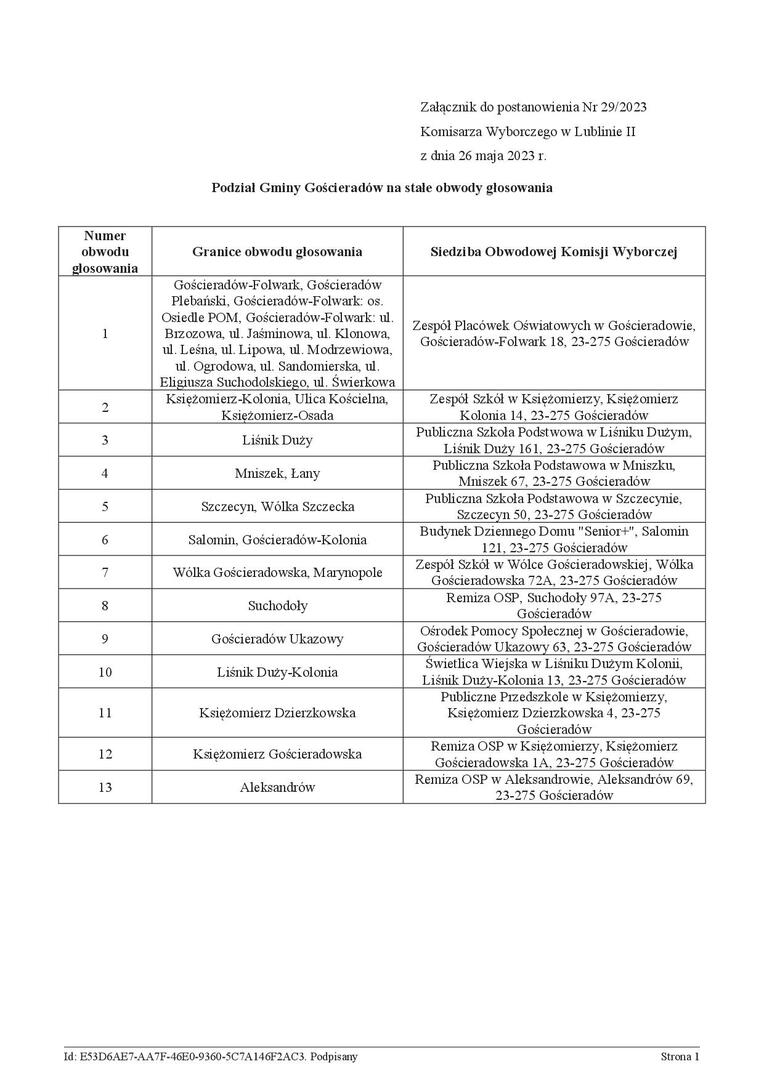 z dnia 26 maja 2023 r. w sprawie zmian w podziale Gminy Gościeradów na stałe obwody głosowania