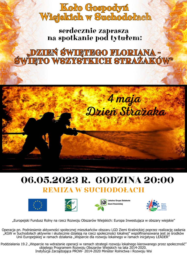 KGW w Suchodołach zaprasza 06.05.2023 godz. 18:00 na spotkanie pt. ,,Świętujemy Rocznice Uchwalenia Konstytucji", godz.19:00 ,,Majówka z KGW w Suchodołach', godz.20:00 ,,Dzień Świętego Floriana-Święto Wszystkich Strażaków'