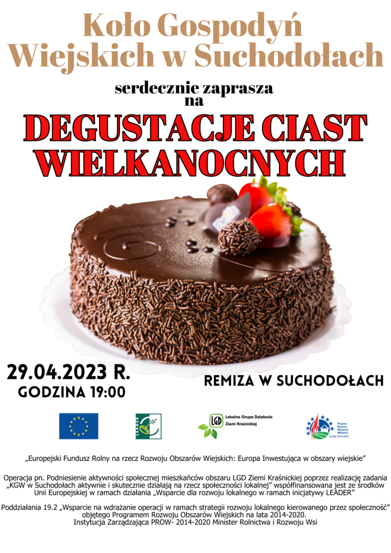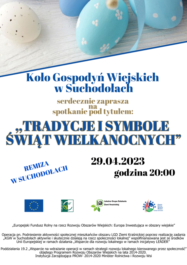 KGW w Suchodołach zaprasza 29.04.2023 godz 18: 00 na spotkanie pt. ,,Wielkanocne Potrawy z KGW w Suchodołach', godz.19:00 ,,Degustacja Ciast Wielkanocnych', godz. 20:00 ,,Tradycje I Symbole Świąt Wielkanocnych"