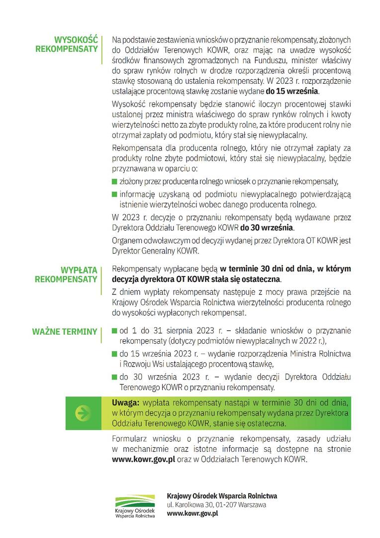 Ze środków finansowych Funduszu będą przyznawane i wypłacane rekompensaty producentom rolnym, którzy nie otrzymali zapłaty za produkty rolne zbyte podmiotowi skupującemu, który stał się niewypłacalny. W bieżącym roku wnioski o przyznanie rekompensaty będzie można składać od dnia 1 sierpnia do dnia 31 sierpnia w odniesieniu do podmiotów, które stały się niewypłacalne w 2022 r. Więcej informacji dotyczących składania wniosków o przyznanie rekompensaty oraz wypłaty środków z Funduszu znajdą Państwo w zakładce Beneficjenci (https://www.gov.pl/web/kowr/beneficjenci ).https:/www.gov.pl/web/kowr/beneficjenci%20).>