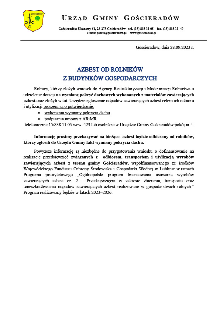 Powyższe informację są niezbędne do przygotowania wniosku o dofinansowanie na realizację przedsięwzięć związanych z odbiorem, transportem i utylizacją wyrobów zawierających azbest z terenu gminy Gościeradów, współfinansowanego ze środków Wojewódzkiego Funduszu Ochrony Środowiska i Gospodarki Wodnej w Lublinie w ramach Programu priorytetowego „Ogólnopolski program finansowania usuwania wyrobów zawierających azbest cz. 2 - Przedsięwzięcia w zakresie zbierania, transportu oraz unieszkodliwiania odpadów zawierających azbest realizowane w gospodarstwach rolnych.” Program realizowany będzie w latach 2023–2026.