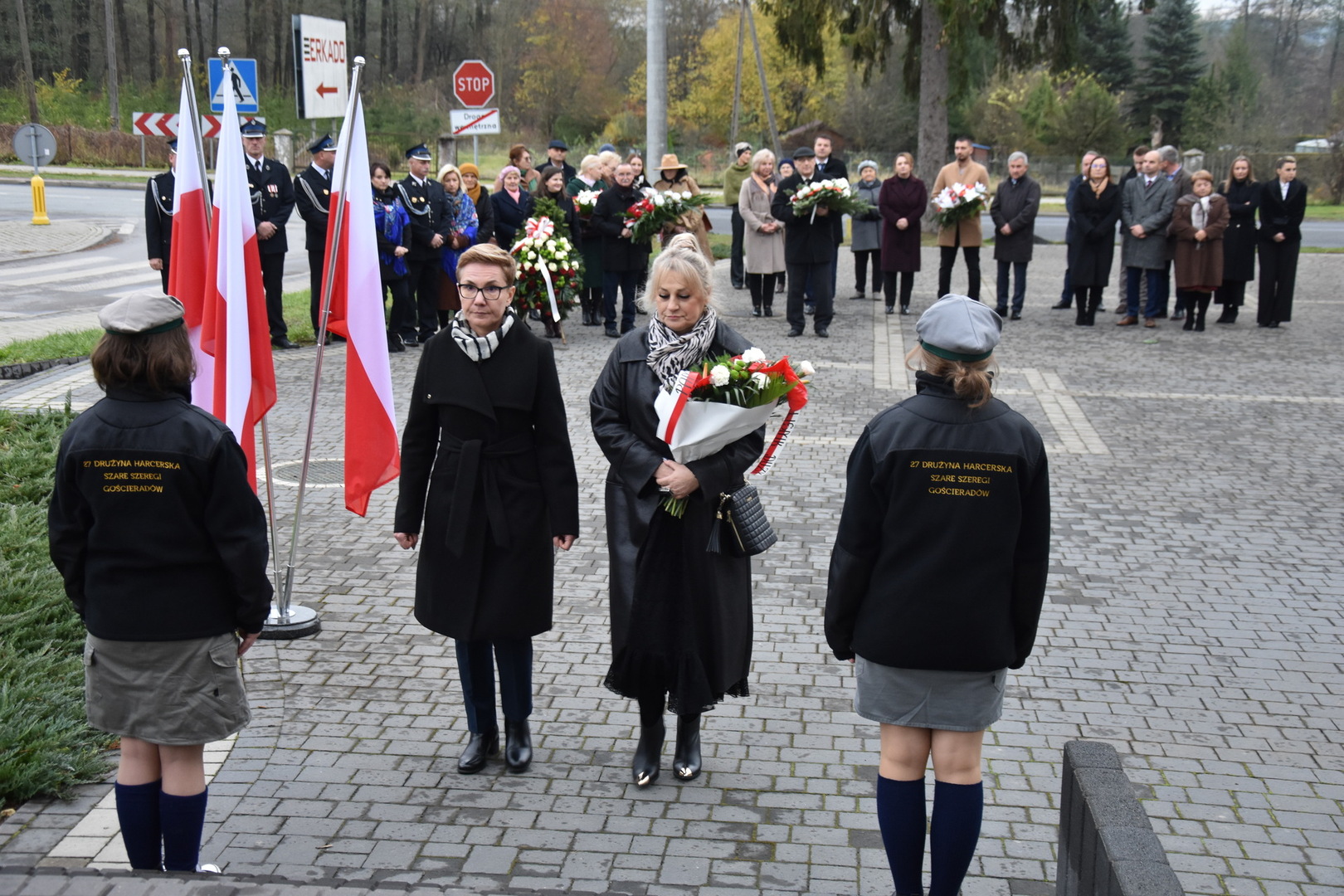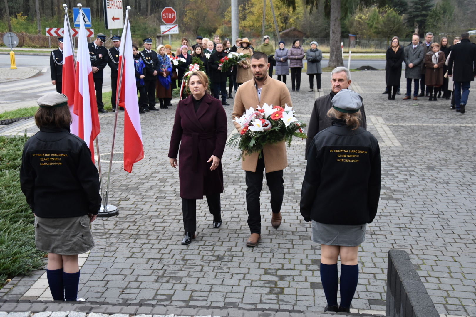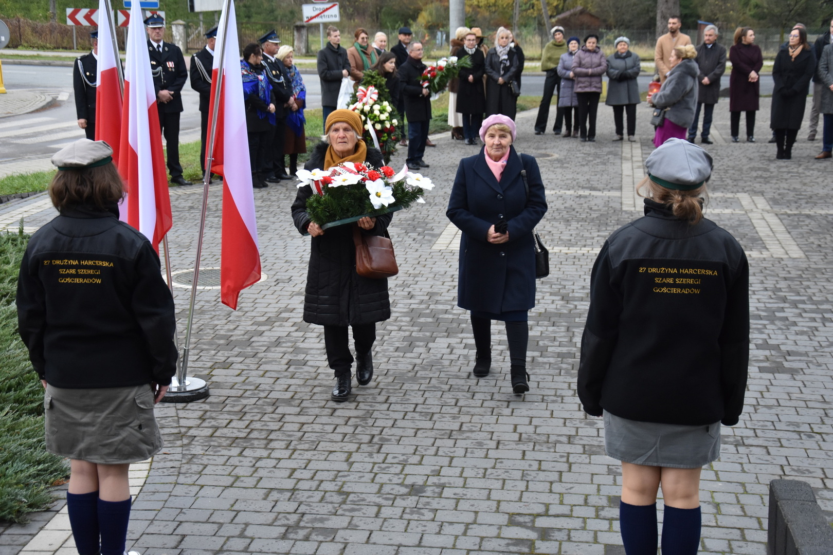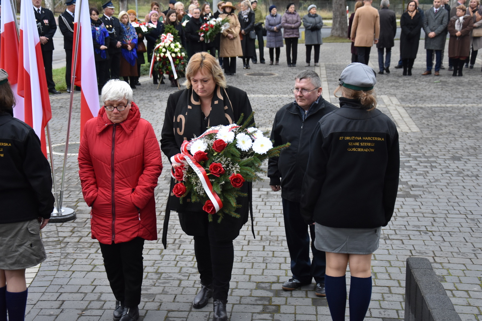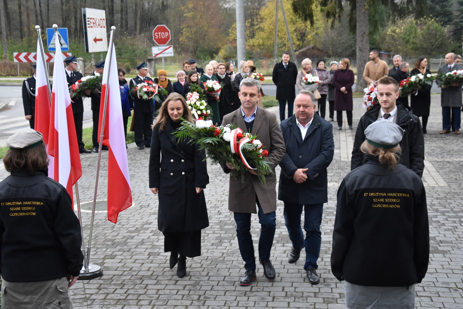 W dniu 11 listopada 2023 r.(sobota) o godz. 11:00 odbyła się Msza Święta odprawiona przez proboszcza ks. kan. Andrzeja Kontka w Kościele Parafialnym w Gościeradowie w intencji Ojczyzny rozpoczynająca się Koncertem Pieśni Patriotycznych wykonanym przez chór Małe Perełki Papieskie z ZPO im. Jana Pawła II w Gościeradowie. W uroczystej mszy św. udział wzięli z pocztami sztandarowymi przedstawiciele partii PSL, szkoły: ZPO im. Jana Pawła II w Gościeradowie, ZS im. Józefa Twaroga w Księżomierzy, PSP im. Janiny Wierzchowskiej w Liśniku Dużym, PSP im. Marii Konopnickiej w Mniszku, PSP im. ks. Karola Konopki w Szczecynie oraz jednostki: OSP Gościeradów, OSP Aleksandrów, OSP Liśnik Duży, OSP OSP Suchodoły oraz delegacja z OSP Salomin. Po Mszy Świętej odbył się Koncert pt. ,,Śpiew Wolności” w wykonaniu artystów sceny operowej: Anny Barskiej (sopran), Tomasza Mazura (baryton), Magdaleny Maciąg (skrzypce) oraz Alesii Aleksandrowicz (fortepian) przygotowany przez dyrektora GOK-u Romana Bissa. Na zakończenie uroczystości Narodowego Święta Niepodległości wójt gminy Mariusz Szczepanik, sekretarz gminy Ewa Lipiec, przewodniczący rady gminy Krzysztof Galant wraz z radnymi gminy, w imieniu starosty kraśnickiego Pawła Kudrela - członek zarządu powiatu Marek Kołtun, w imieniu radnej powiatu Edyty Dudzińskiej – radna gminy Aneta Stasiak, delegacja partii PSL, szkoły z terenu gminy, dyrektor Gminnej Biblioteki Publicznej Dorota Karkusiewicz, delegacja Domu Pomocy Społecznej w Gościeradowie, delegacja firmy Erkado Sp. z o.o., Stowarzyszenie Na Rzecz Rozwoju Wsi Szczecyn, Koło Gospodyń Wiejskich ,,Tatarczanki” z Salomina wraz z Ochotniczą Strażą Pożarną z Salomina, Koło Gospodyń Wiejskich w Liśniku Dużym, Koło Gospodyń Wiejskich w Mniszku, Klub Seniora oraz Ochotnicza Straż Pożarna z Aleksandrowa upamiętniając odzyskania niepodległości przez Polskę złożyli wiązanki oraz zapalili znicze przy Pomniku Pamięci Narodowej w Gościeradowie. W tym wyjątkowym dniu wartę przy pomniku pełnili harcerze z 27 DH ,,Szare Szeregi” z Gościeradowa. Dziękujemy pracownikom GOK-u za pomoc w przygotowaniu uroczystości.