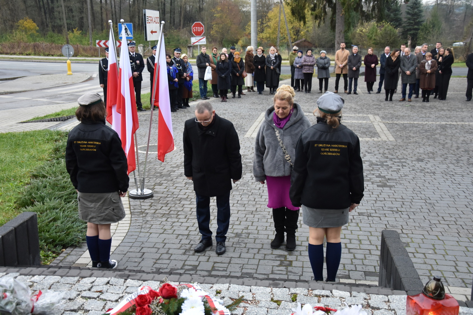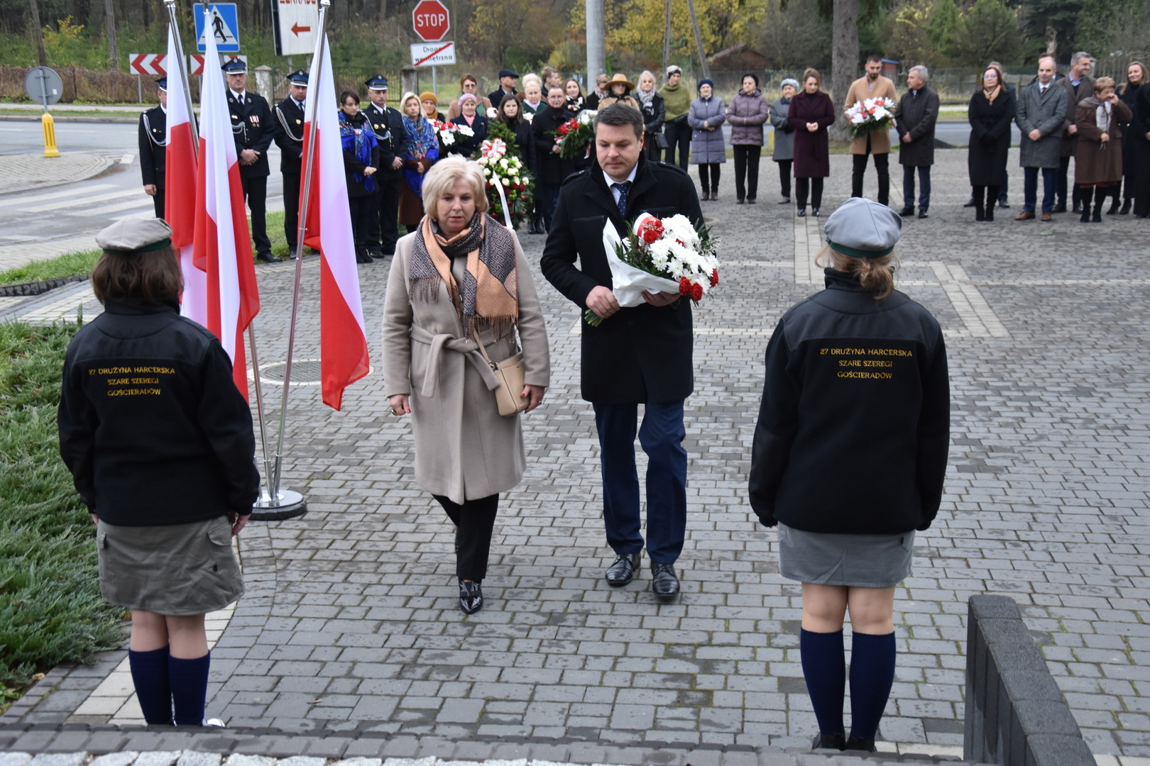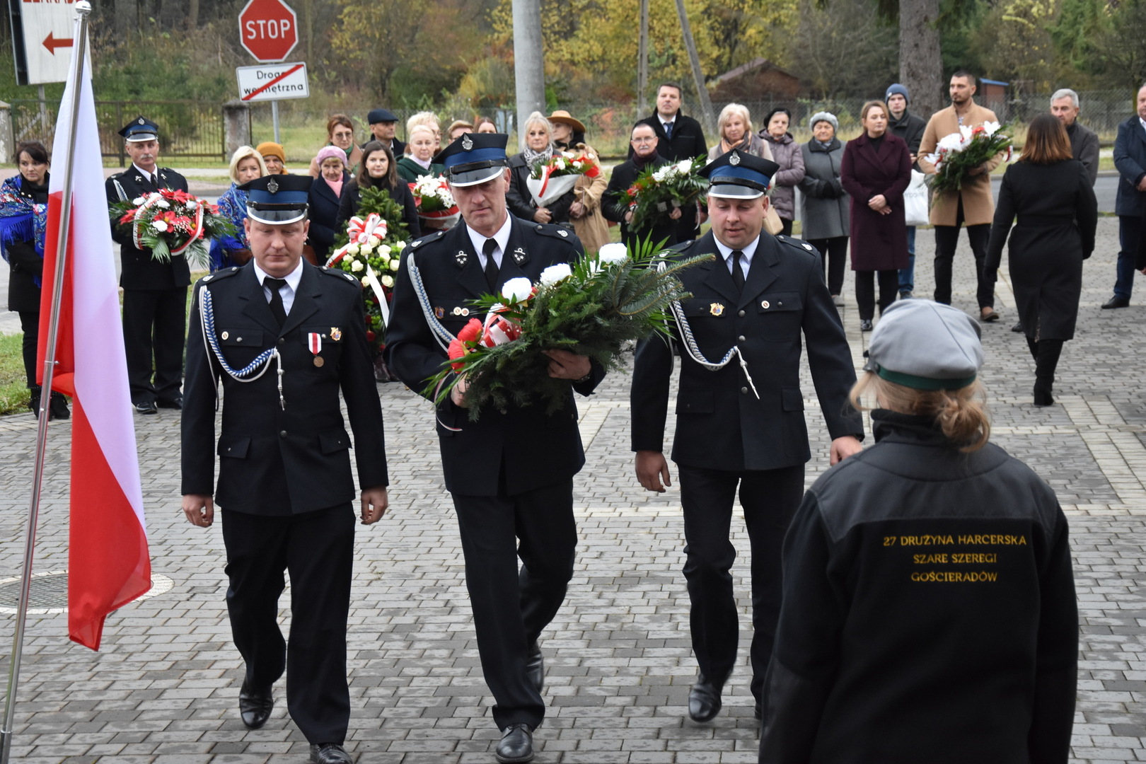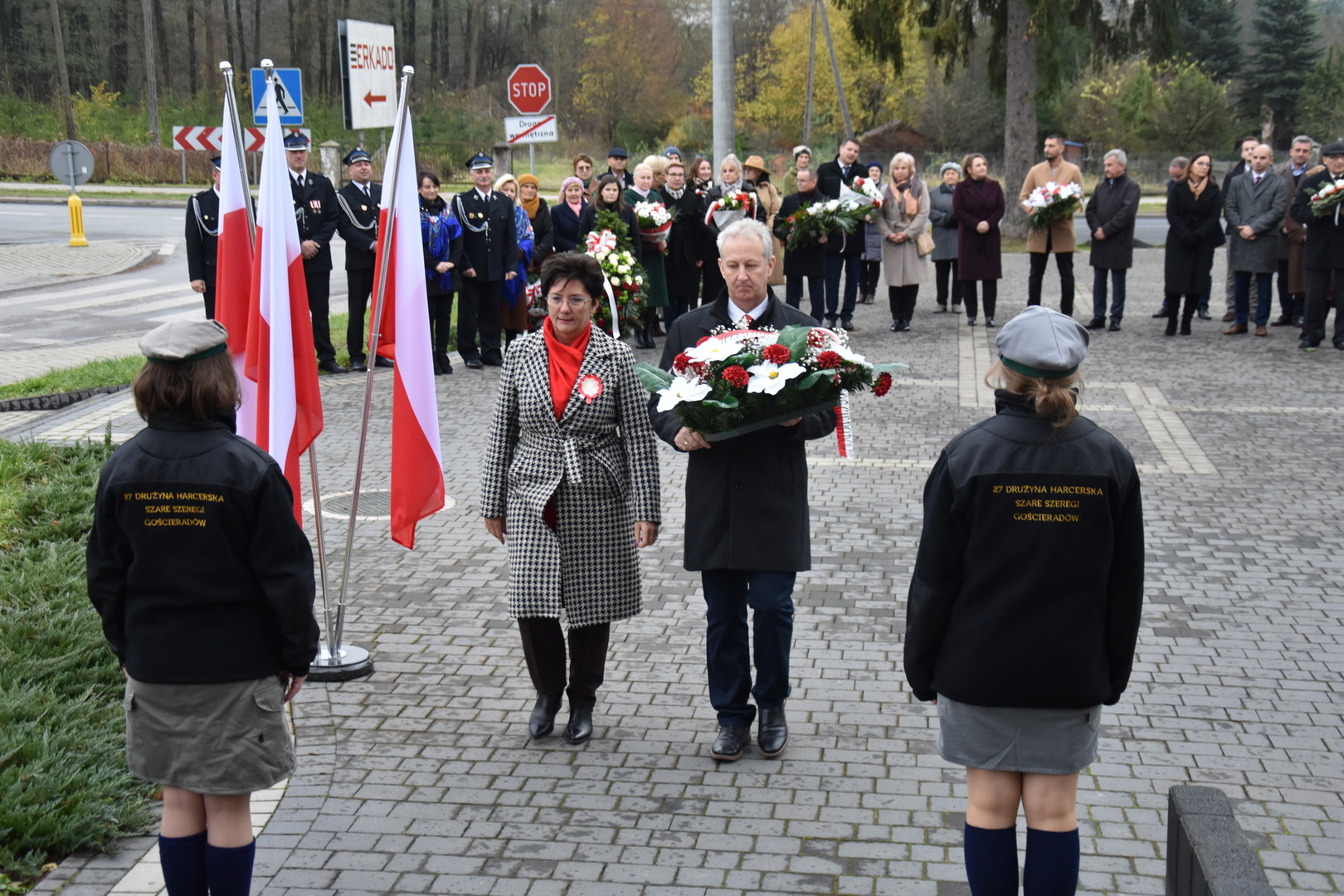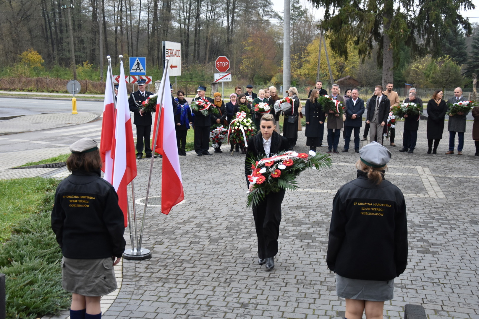 W dniu 11 listopada 2023 r.(sobota) o godz. 11:00 odbyła się Msza Święta odprawiona przez proboszcza ks. kan. Andrzeja Kontka w Kościele Parafialnym w Gościeradowie w intencji Ojczyzny rozpoczynająca się Koncertem Pieśni Patriotycznych wykonanym przez chór Małe Perełki Papieskie z ZPO im. Jana Pawła II w Gościeradowie. W uroczystej mszy św. udział wzięli z pocztami sztandarowymi przedstawiciele partii PSL, szkoły: ZPO im. Jana Pawła II w Gościeradowie, ZS im. Józefa Twaroga w Księżomierzy, PSP im. Janiny Wierzchowskiej w Liśniku Dużym, PSP im. Marii Konopnickiej w Mniszku, PSP im. ks. Karola Konopki w Szczecynie oraz jednostki: OSP Gościeradów, OSP Aleksandrów, OSP Liśnik Duży, OSP OSP Suchodoły oraz delegacja z OSP Salomin. Po Mszy Świętej odbył się Koncert pt. ,,Śpiew Wolności” w wykonaniu artystów sceny operowej: Anny Barskiej (sopran), Tomasza Mazura (baryton), Magdaleny Maciąg (skrzypce) oraz Alesii Aleksandrowicz (fortepian) przygotowany przez dyrektora GOK-u Romana Bissa. Na zakończenie uroczystości Narodowego Święta Niepodległości wójt gminy Mariusz Szczepanik, sekretarz gminy Ewa Lipiec, przewodniczący rady gminy Krzysztof Galant wraz z radnymi gminy, w imieniu starosty kraśnickiego Pawła Kudrela - członek zarządu powiatu Marek Kołtun, w imieniu radnej powiatu Edyty Dudzińskiej – radna gminy Aneta Stasiak, delegacja partii PSL, szkoły z terenu gminy, dyrektor Gminnej Biblioteki Publicznej Dorota Karkusiewicz, delegacja Domu Pomocy Społecznej w Gościeradowie, delegacja firmy Erkado Sp. z o.o., Stowarzyszenie Na Rzecz Rozwoju Wsi Szczecyn, Koło Gospodyń Wiejskich ,,Tatarczanki” z Salomina wraz z Ochotniczą Strażą Pożarną z Salomina, Koło Gospodyń Wiejskich w Liśniku Dużym, Koło Gospodyń Wiejskich w Mniszku, Klub Seniora oraz Ochotnicza Straż Pożarna z Aleksandrowa upamiętniając odzyskania niepodległości przez Polskę złożyli wiązanki oraz zapalili znicze przy Pomniku Pamięci Narodowej w Gościeradowie. W tym wyjątkowym dniu wartę przy pomniku pełnili harcerze z 27 DH ,,Szare Szeregi” z Gościeradowa. Dziękujemy pracownikom GOK-u za pomoc w przygotowaniu uroczystości.