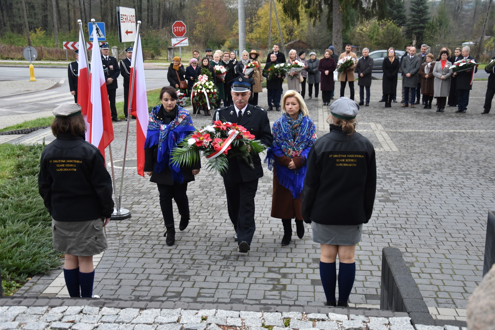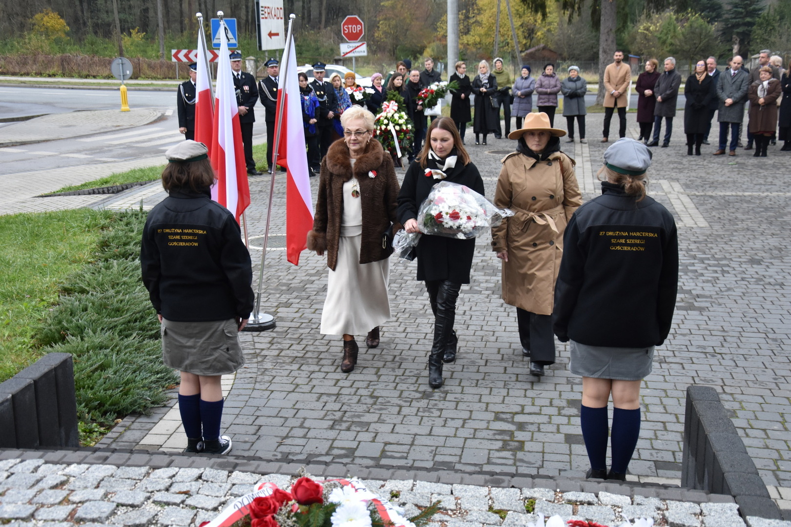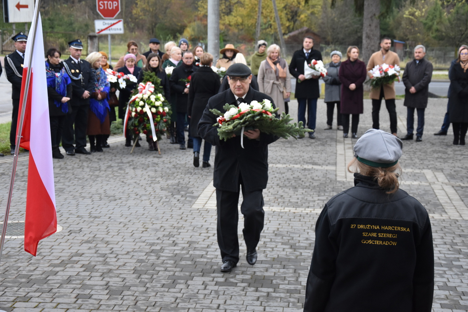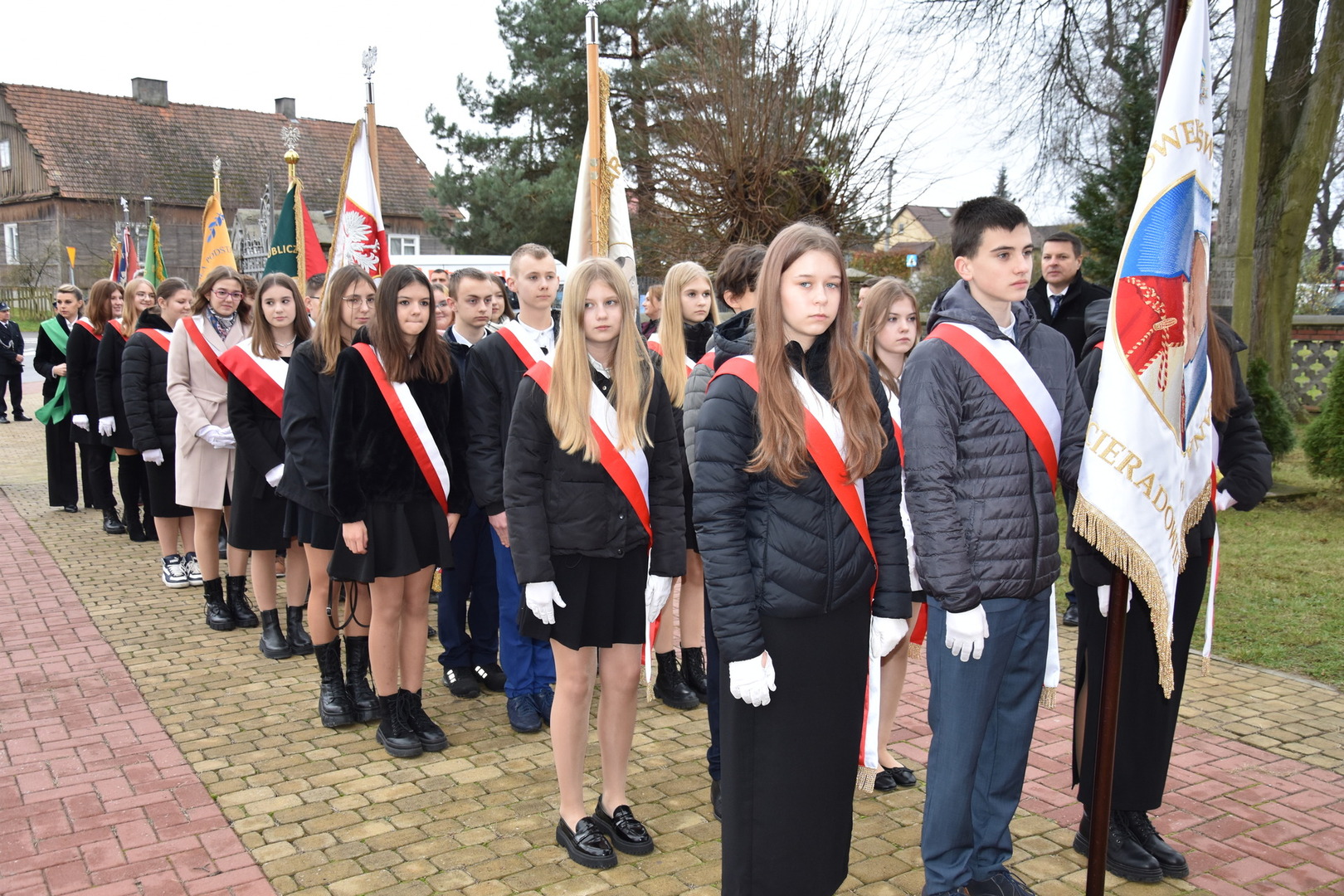 W dniu 11 listopada 2023 r.(sobota) o godz. 11:00 odbyła się Msza Święta odprawiona przez proboszcza ks. kan. Andrzeja Kontka w Kościele Parafialnym w Gościeradowie w intencji Ojczyzny rozpoczynająca się Koncertem Pieśni Patriotycznych wykonanym przez chór Małe Perełki Papieskie z ZPO im. Jana Pawła II w Gościeradowie. W uroczystej mszy św. udział wzięli z pocztami sztandarowymi przedstawiciele partii PSL, szkoły: ZPO im. Jana Pawła II w Gościeradowie, ZS im. Józefa Twaroga w Księżomierzy, PSP im. Janiny Wierzchowskiej w Liśniku Dużym, PSP im. Marii Konopnickiej w Mniszku, PSP im. ks. Karola Konopki w Szczecynie oraz jednostki: OSP Gościeradów, OSP Aleksandrów, OSP Liśnik Duży, OSP OSP Suchodoły oraz delegacja z OSP Salomin. Po Mszy Świętej odbył się Koncert pt. ,,Śpiew Wolności” w wykonaniu artystów sceny operowej: Anny Barskiej (sopran), Tomasza Mazura (baryton), Magdaleny Maciąg (skrzypce) oraz Alesii Aleksandrowicz (fortepian) przygotowany przez dyrektora GOK-u Romana Bissa. Na zakończenie uroczystości Narodowego Święta Niepodległości wójt gminy Mariusz Szczepanik, sekretarz gminy Ewa Lipiec, przewodniczący rady gminy Krzysztof Galant wraz z radnymi gminy, w imieniu starosty kraśnickiego Pawła Kudrela - członek zarządu powiatu Marek Kołtun, w imieniu radnej powiatu Edyty Dudzińskiej – radna gminy Aneta Stasiak, delegacja partii PSL, szkoły z terenu gminy, dyrektor Gminnej Biblioteki Publicznej Dorota Karkusiewicz, delegacja Domu Pomocy Społecznej w Gościeradowie, delegacja firmy Erkado Sp. z o.o., Stowarzyszenie Na Rzecz Rozwoju Wsi Szczecyn, Koło Gospodyń Wiejskich ,,Tatarczanki” z Salomina wraz z Ochotniczą Strażą Pożarną z Salomina, Koło Gospodyń Wiejskich w Liśniku Dużym, Koło Gospodyń Wiejskich w Mniszku, Klub Seniora oraz Ochotnicza Straż Pożarna z Aleksandrowa upamiętniając odzyskania niepodległości przez Polskę złożyli wiązanki oraz zapalili znicze przy Pomniku Pamięci Narodowej w Gościeradowie. W tym wyjątkowym dniu wartę przy pomniku pełnili harcerze z 27 DH ,,Szare Szeregi” z Gościeradowa. Dziękujemy pracownikom GOK-u za pomoc w przygotowaniu uroczystości.
