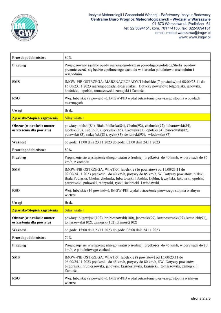 SMSIMGW-PIB OSTRZEGA: WIATR/1 lubelskie (8 powiatów) od 15:00/23.11 do 06:00/24.11.2023 prędkośćdo 45 km/h, porywy do 80 km/h, SW. Dotyczy powiatów: biłgorajski, hrubieszowski, janowski, krasnostawski, kraśnicki, tomaszowski, zamojski i Zamość.