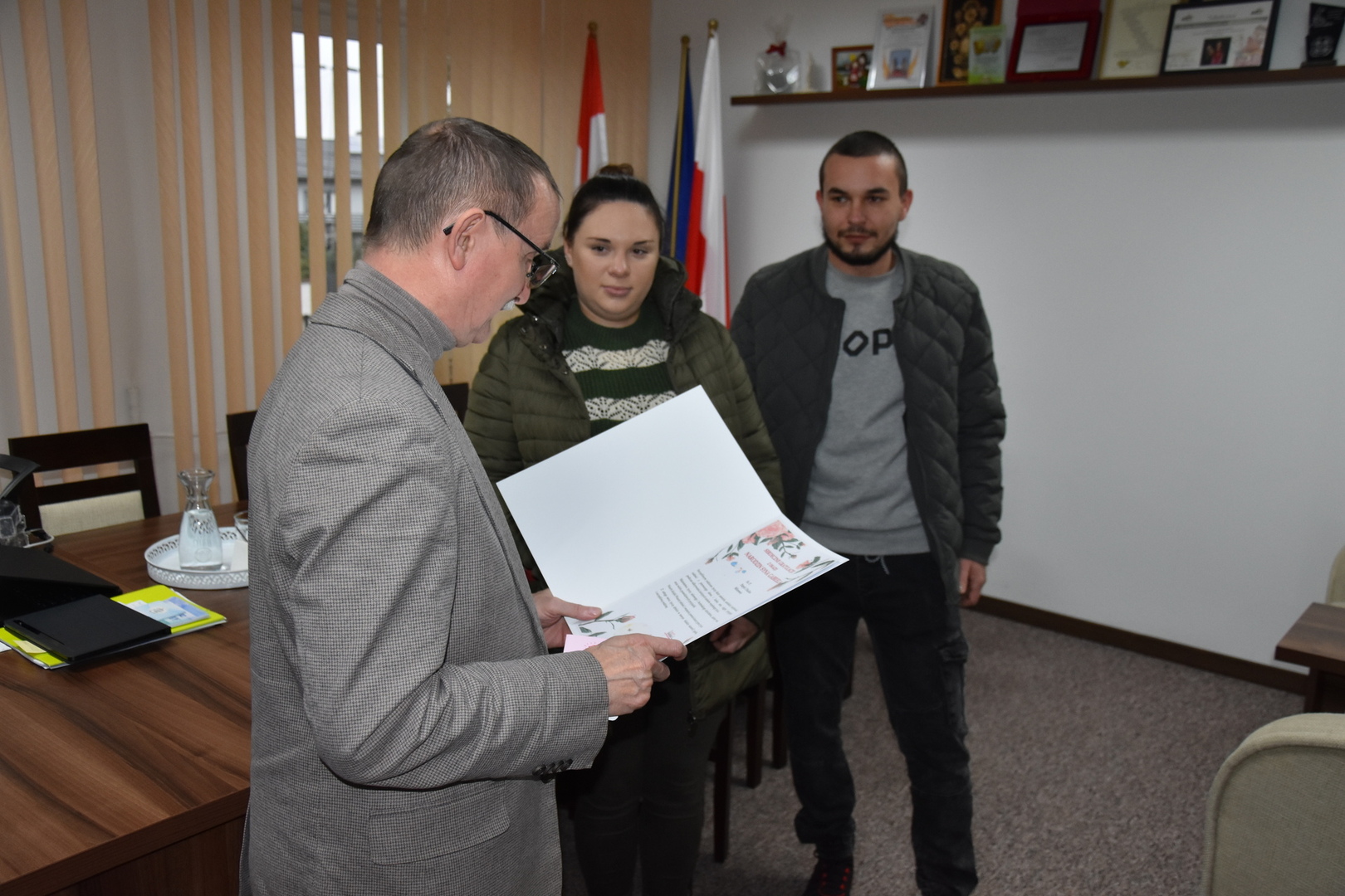 Podczas dzisiejszego spotkania tj. 23.11.2023r. w Urzędzie Gminy Gościeradów, wójt Mariusz Szczepanik serdecznie gratulował świeżo upieczonym rodzicom Patrykowi i Paulinie Milerom z okazji narodzin syna Gabriela oraz złożył życzenia dla całej rodziny.