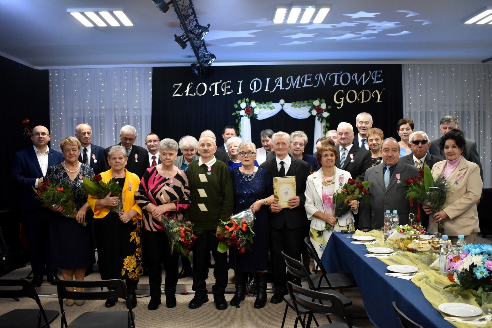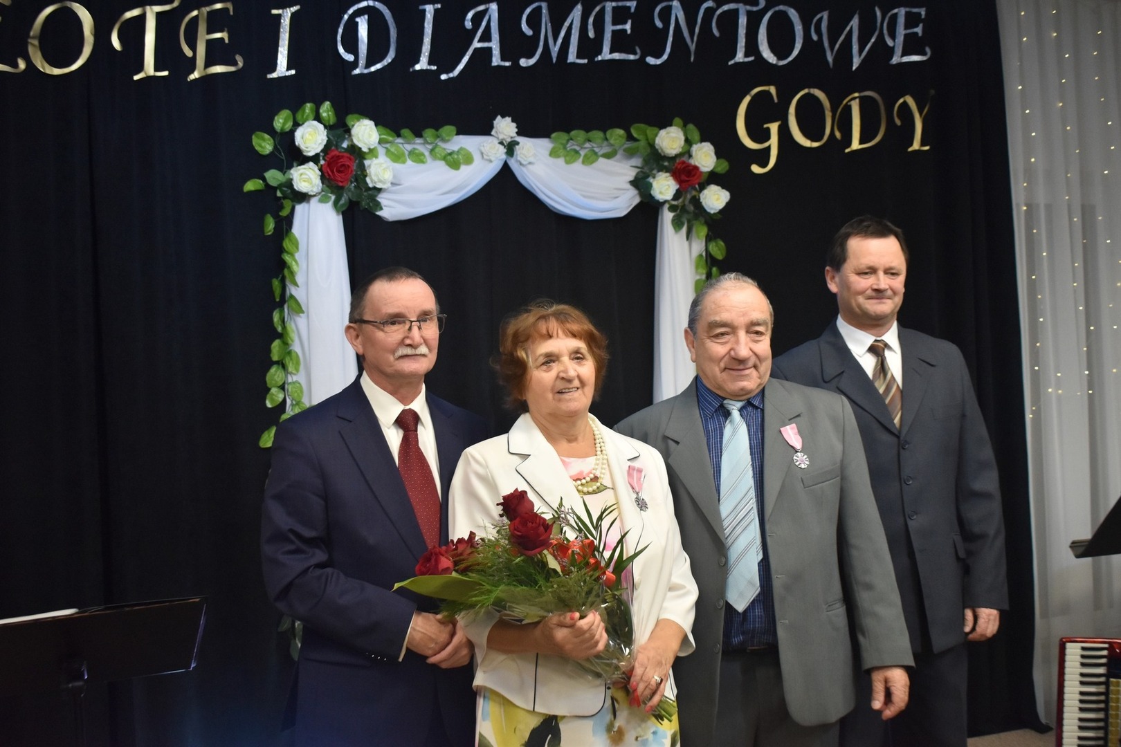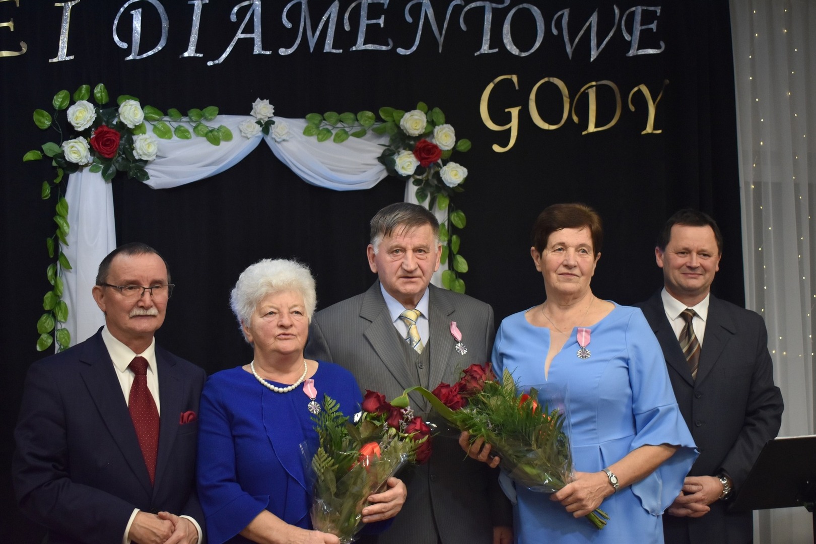 Po przemówieniach, Wójt Gminy odznaczył złotych i diamentowych jubilatów Medalami Za Długoletnie Pożycie Małżeńskie, przyznane przez Prezydenta RP Andrzeja Dudę. Świętujące pary obdarowano także kwiatami i pamiątkowymi dyplomami wręczanymi przez Romana Bissa Dyrektora Gminnego Ośrodka Kultury oraz Grzegorza Tomczyka Zastępcę Kierownika Urzędu Stanu Cywilnego.