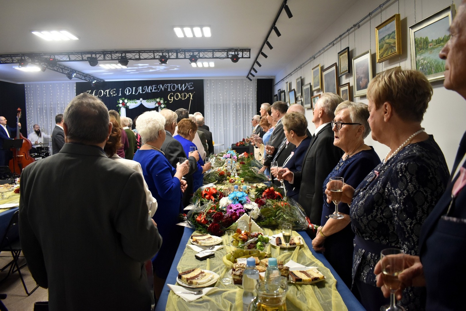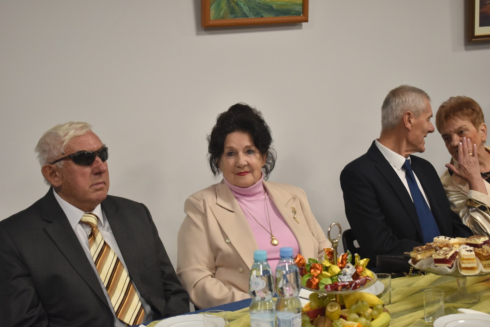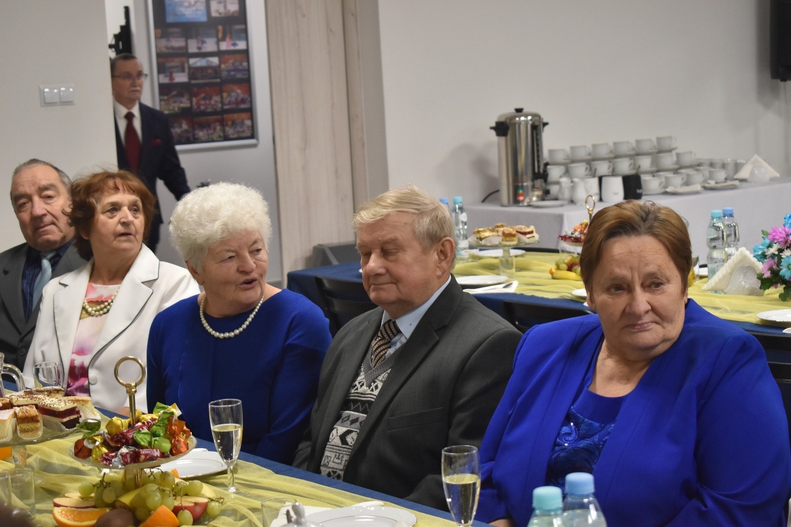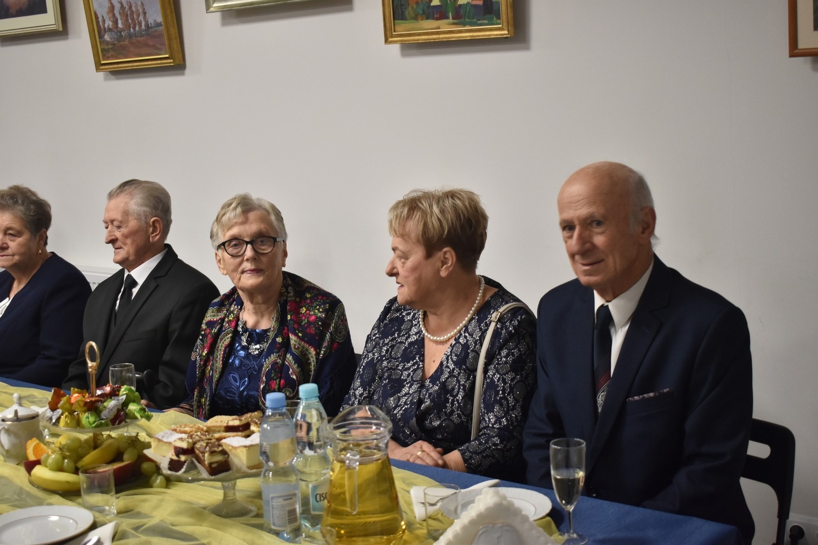 Po części oficjalnej uroczystości wszyscy usiedli do słodkiego poczęstunku. Tę mniej oficjalną część spotkania rozpoczął tort i toast za zdrowie jubilatów wzniesiony lampką szampana.