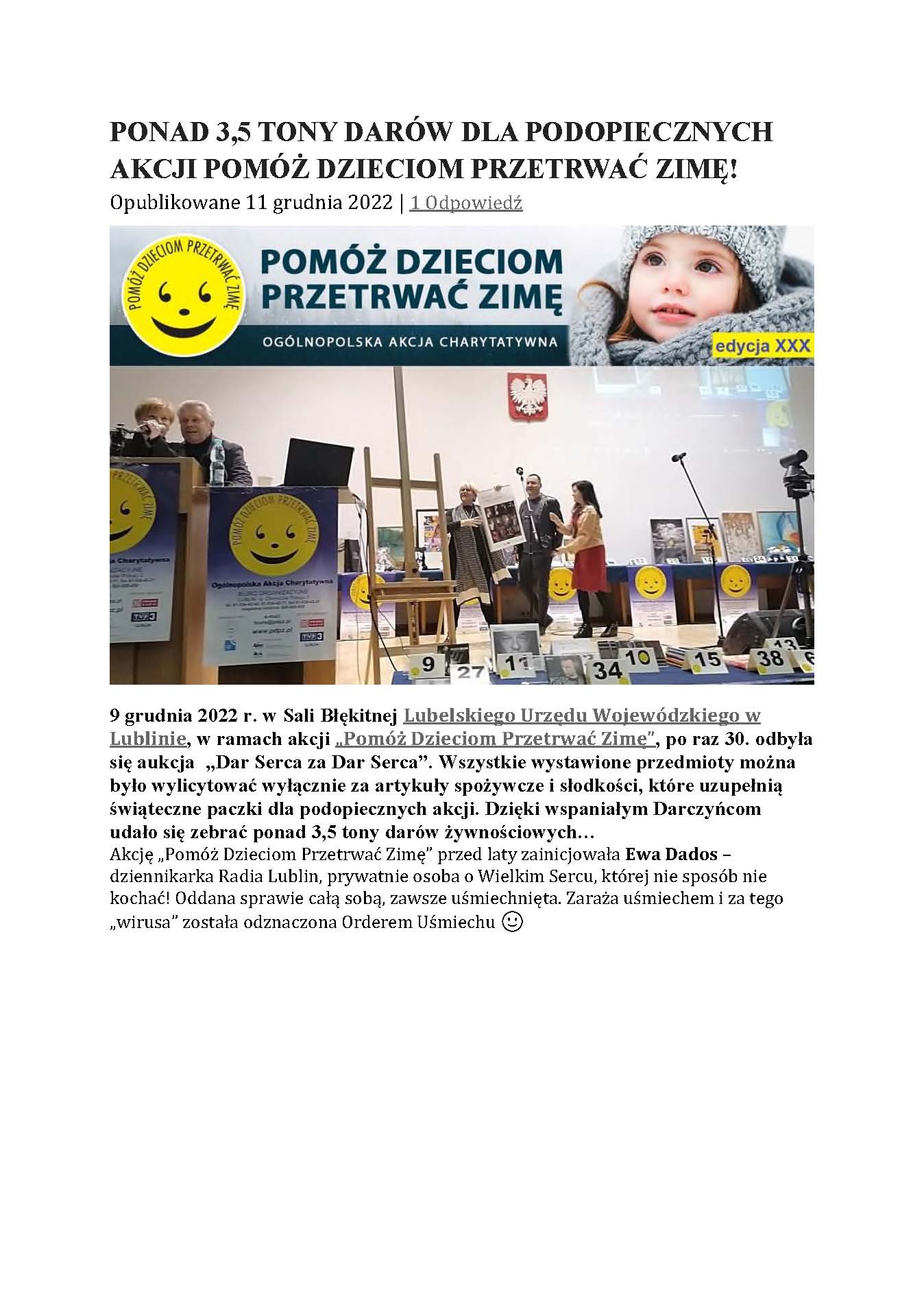 w imieniu Głównego Społecznego Komitetu Organizacyjnego Ogólnopolskiej Akcji Charytatywnej Pomóż Dzieciom Przetrwać Zimę 2023 przy Radio Lublin S.A., serdecznie zapraszamy do wzięcia udziału, wraz z rodziną i przyjaciółmi, w tegorocznej „Charytatywnej Aukcji Przedmiotów Dar Serca za Dar Serca”, organizowanej w ramach Akcji „Pomóż Dzieciom Przetrwać Zimę” pod patronatem Wojewody Lubelskiego.