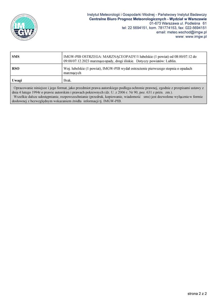 SMS IMGW-PIB OSTRZEGA: MARZNĄCE OPADY/1 lubelskie (1 powiat) od 08:00/07.12 do 09:00/07.12.2023 marznące opady, drogi śliskie. Dotyczy powiatów: Lublin.