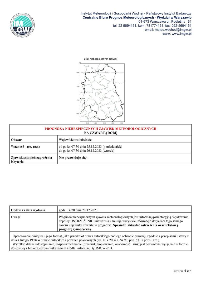 Obszar Województwo lubelskie Ważność (cz. urz.) od godz. 07:30 dnia 25.12.2023 (poniedziałek) do godz. 07:30 dnia 26.12.2023 (wtorek)