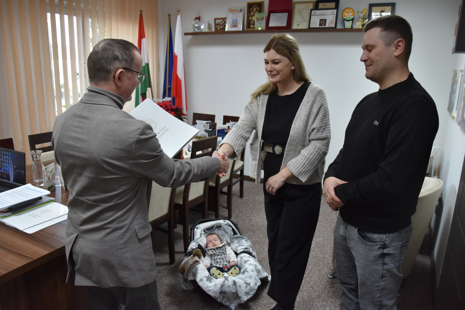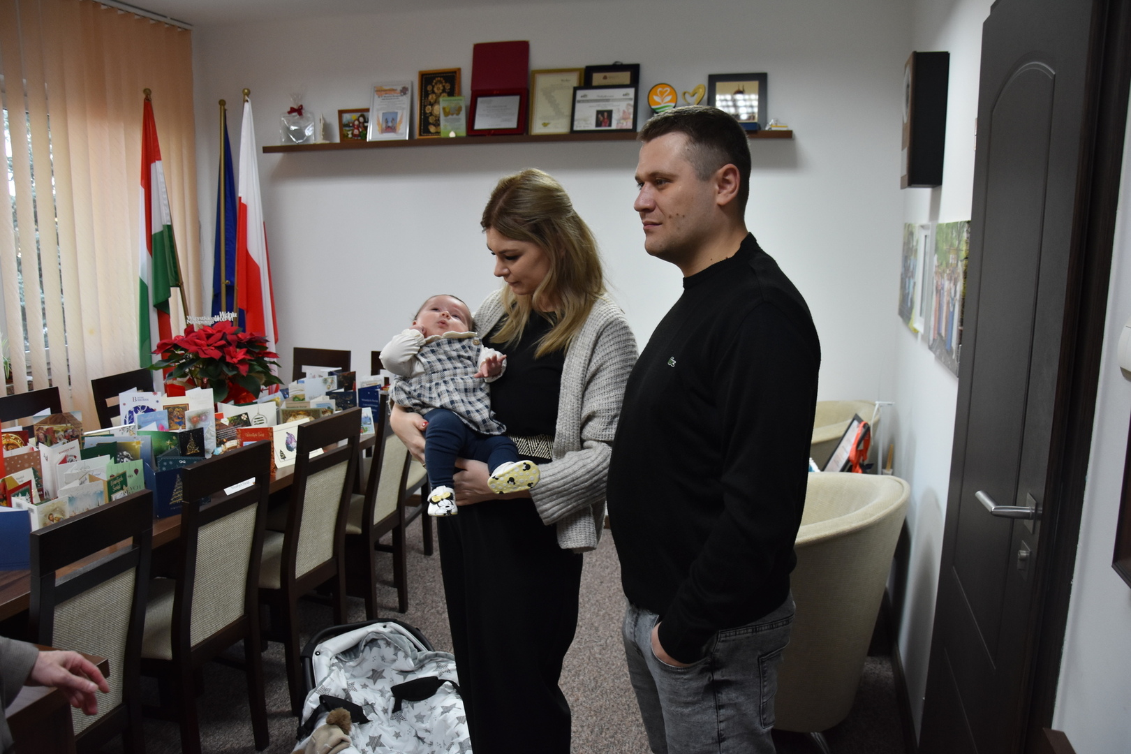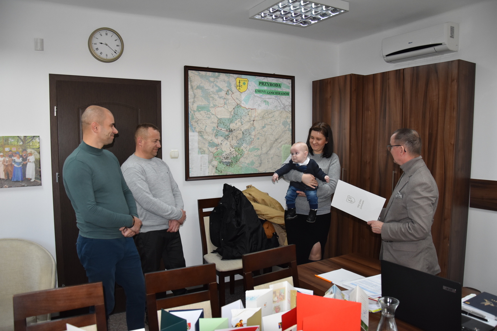W dniu dzisiejszym tj. 28 grudnia 2023 r. zostali powitani nowi mieszkańcy gminy Gościeradów. Wójt Mariusz Szczepanik oraz Przewodniczący Rady Gminy Gościeradów Krzysztof Galant powitali świeżo upieczonych rodziców przybyłych na spotkania: Bartłomieja i Aldonę Tylusów wraz z córką Klarą oraz Piotra i Sylwię Rybów wraz z synem Kacprem.