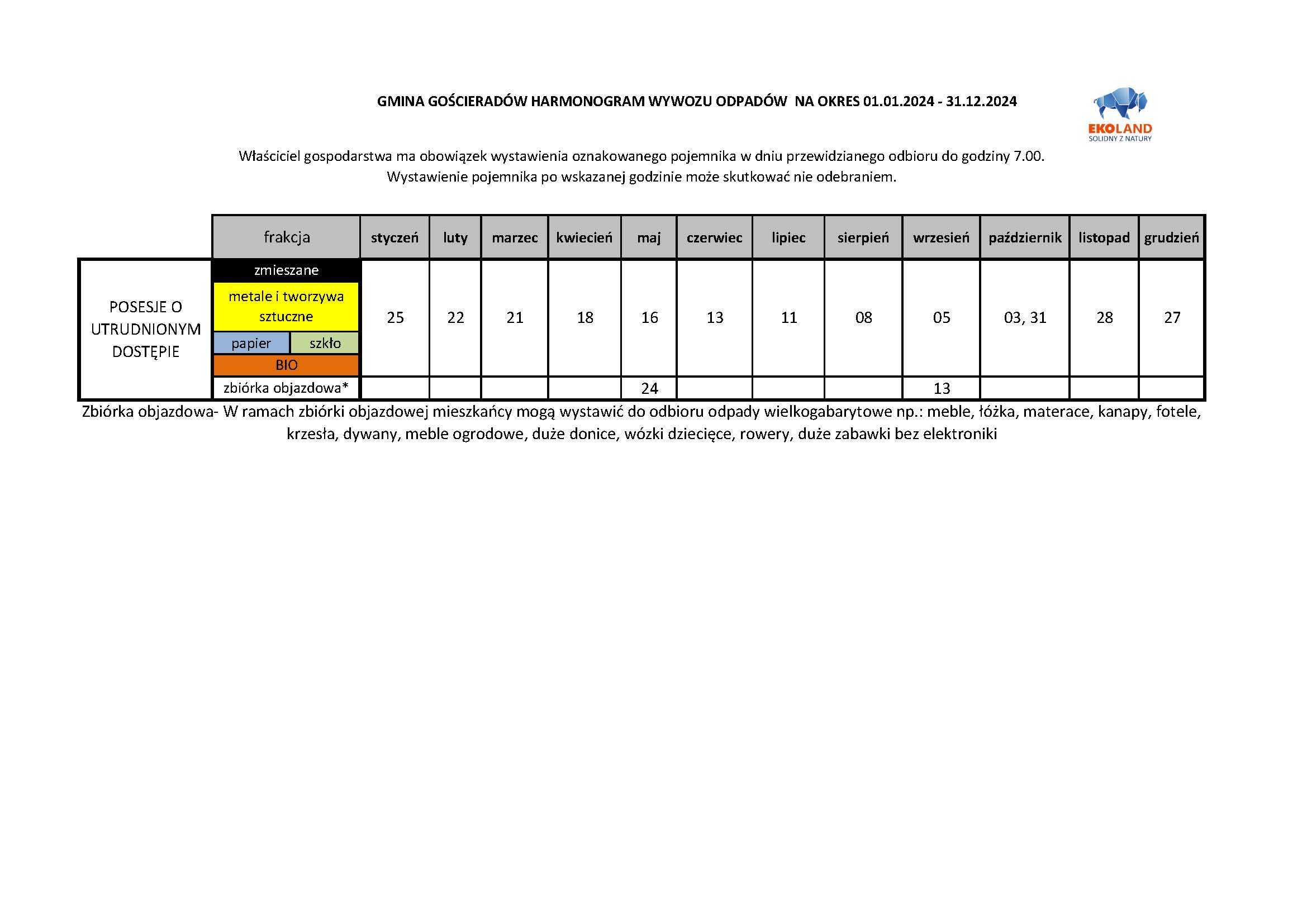 Harmonogram wywozu odpadów - posesje o utrudnionym dostępie