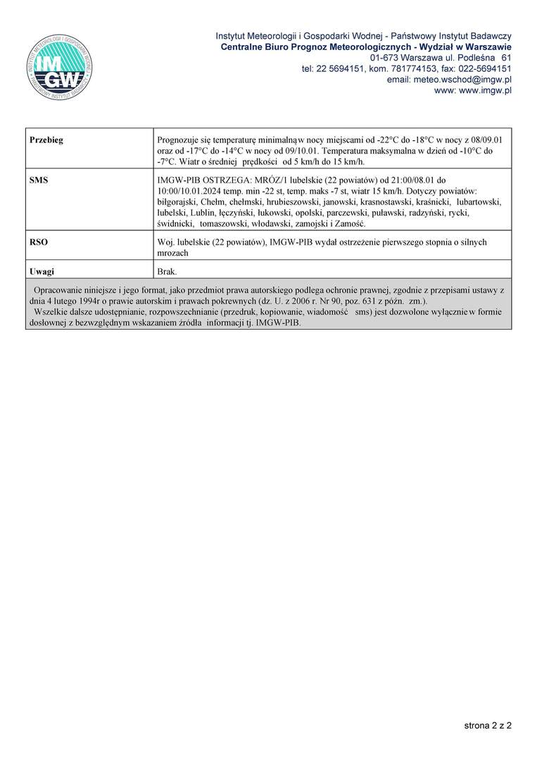 SMS IMGW-PIB OSTRZEGA: MRÓZ/1 lubelskie (22 powiatów) od 21:00/08.01 do 10:00/10.01.2024 temp. min -22 st, temp. maks -7 st, wiatr 15 km/h. Dotyczy powiatów: biłgorajski, Chełm, chełmski, hrubieszowski, janowski, krasnostawski, kraśnicki, lubartowski, lubelski, Lublin, łęczyński, łukowski, opolski, parczewski, puławski, radzyński, rycki, świdnicki, tomaszowski, włodawski, zamojski i Zamość.