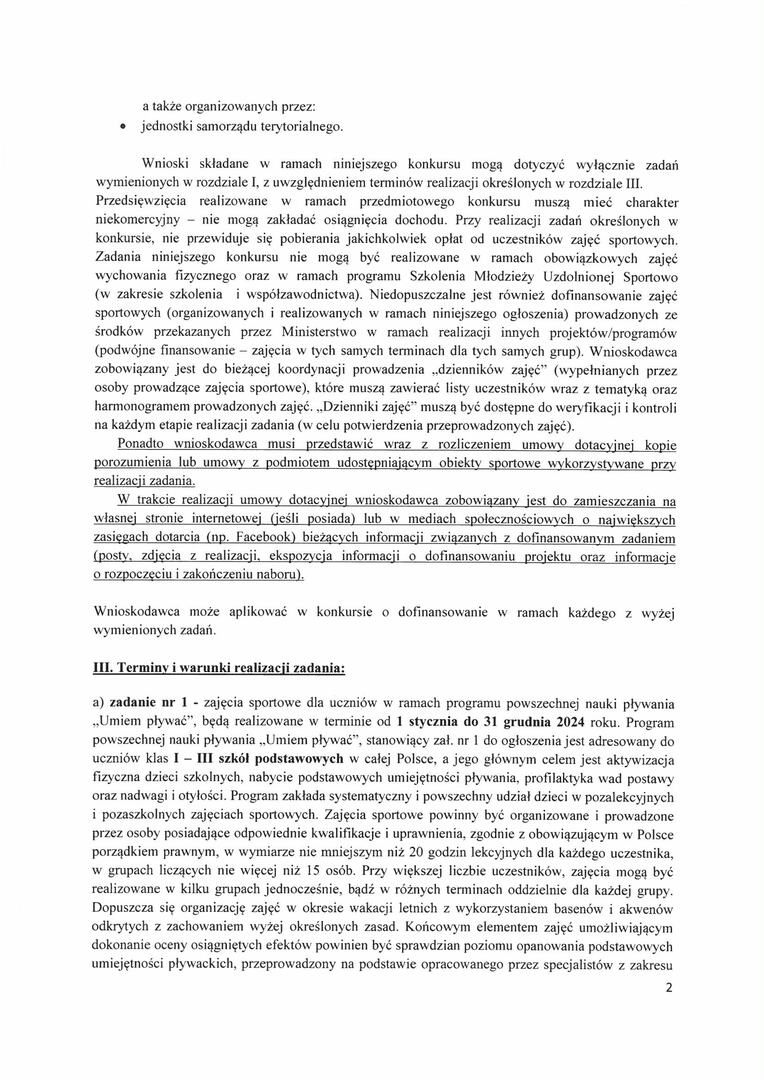 a) zadanie nr 1 - zajęcia sportowe dla uczniów w ramach programu powszechnej nauki pływania „Umiem pływać”, będą realizowane w terminie od 1 stycznia do 31 grudnia 2024 roku. Program powszechnej nauki pływania „Umiem pływać”, stanowiący zał. nr 1 do ogłoszenia jest adresowany do uczniów klas I - III szkół podstawowych w całej Polsce, a jego głównym celem jest aktywizacja fizyczna dzieci szkolnych, nabycie podstawowych umiejętności pływania, profilaktyka wad postawy oraz nadwagi i otyłości. Program zakłada systematyczny i powszechny udział dzieci w pozalekcyjnych i pozaszkolnych zajęciach sportowych. Zajęcia sportowe powinny być organizowane i prowadzone przez osoby posiadające odpowiednie kwalifikacje i uprawnienia, zgodnie z obowiązującym w Polsce porządkiem prawnym, w wymiarze nie mniejszym niż 20 godzin lekcyjnych dla każdego uczestnika, w grupach liczących nie więcej niż 15 osób. Przy większej liczbie uczestników, zajęcia mogą być realizowane w kilku grupach jednocześnie, bądź w różnych terminach oddzielnie dla każdej grupy. Dopuszcza się organizację zajęć w okresie wakacji letnich z wykorzystaniem basenów i akwenów odkrytych z zachowaniem wyżej określonych zasad. Końcowym elementem zajęć umożliwiającym dokonanie oceny osiągniętych efektów powinien być sprawdzian poziomu opanowania podstawowych umiejętności pływackich, przeprowadzony na podstawie opracowanego przez specjalistów z zakresu metodyki nauczania pływania testu, stanowiącego załącznik nr 2 do ogłoszenia. Zaleca się również, aby uczestnicy zajęć, w trakcie realizacji nauki pływania, zostali zapoznani z podstawowymi zasadami bezpiecznego przebywania w wodzie oraz w pobliżu akwenów wodnych.