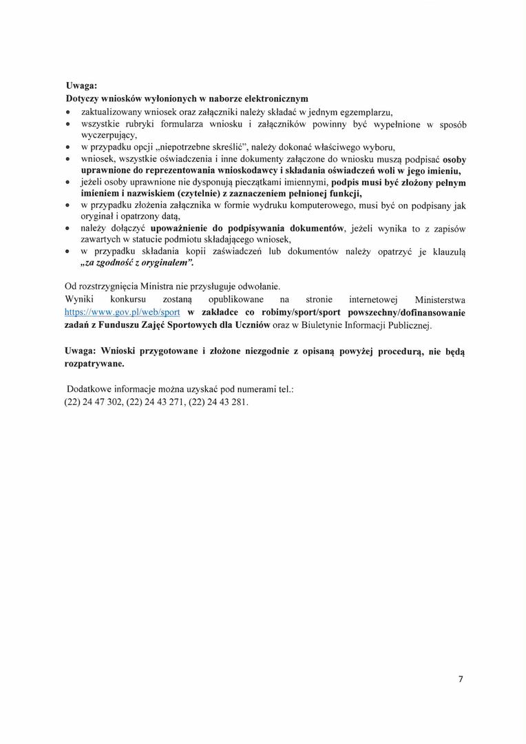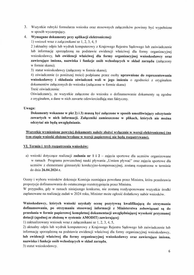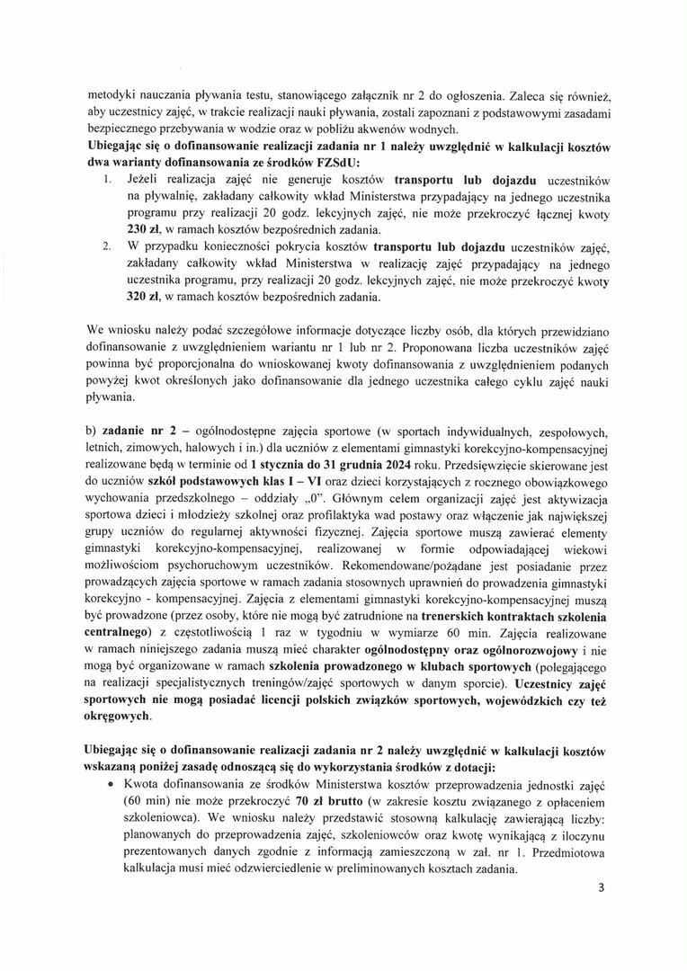 a) wnioski dotyczące realizacji zadania nr 1 i 2 - zajęcia sportowe dla uczniów organizowane w ramach Programu powszechnej nauki pływania „Umiem pływać” oraz zajęcia sportowe dla uczniów z elementami gimnastyki korekcyjno-kompensacyjnej, zostaną rozpatrzone w terminie do dnia 26.04.2024 r.