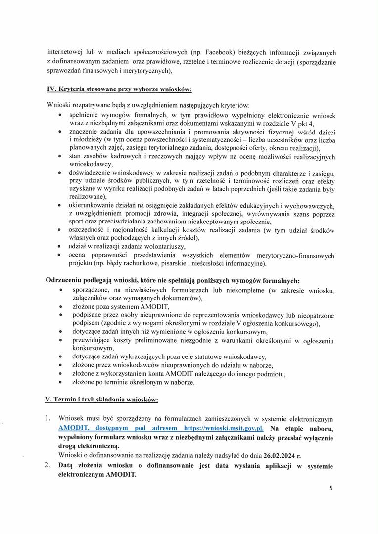 Wnioski o dofinansowanie na realizację zadania należy nadsyłać do dnia 26.02.2024 r.