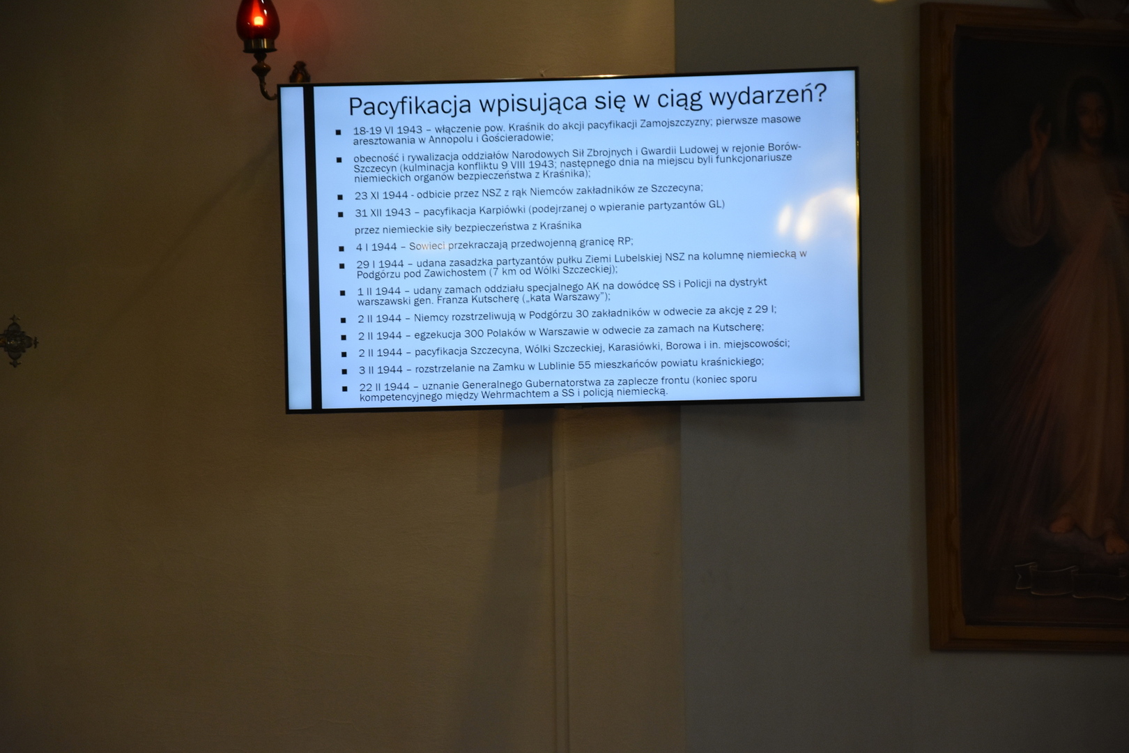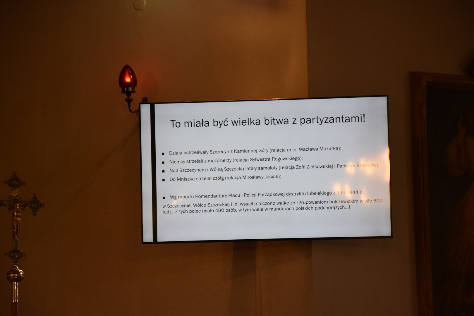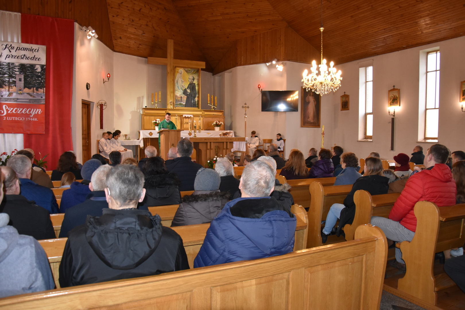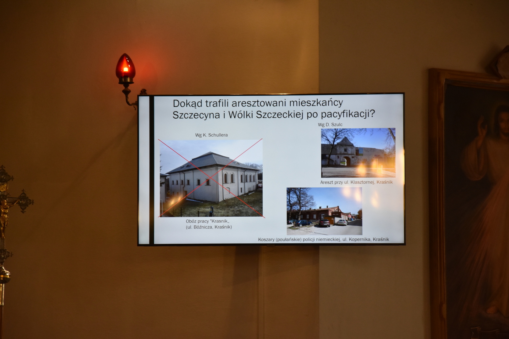 11 lutego br. w Kościele pw. Św. Maksymiliana Kolbe w Szczecynie o godzinie 9:00 odbyła się Msza Święta, po której dr Dominik Szulc pracownik Instytutu Pamięci Narodowej w Szczecynie zaprezentował zgromadzone Informacje na temat Pacyfikacji Wsi Szczecyn, Wólka Szczecka oraz pobliskich okolic z 1944 roku.