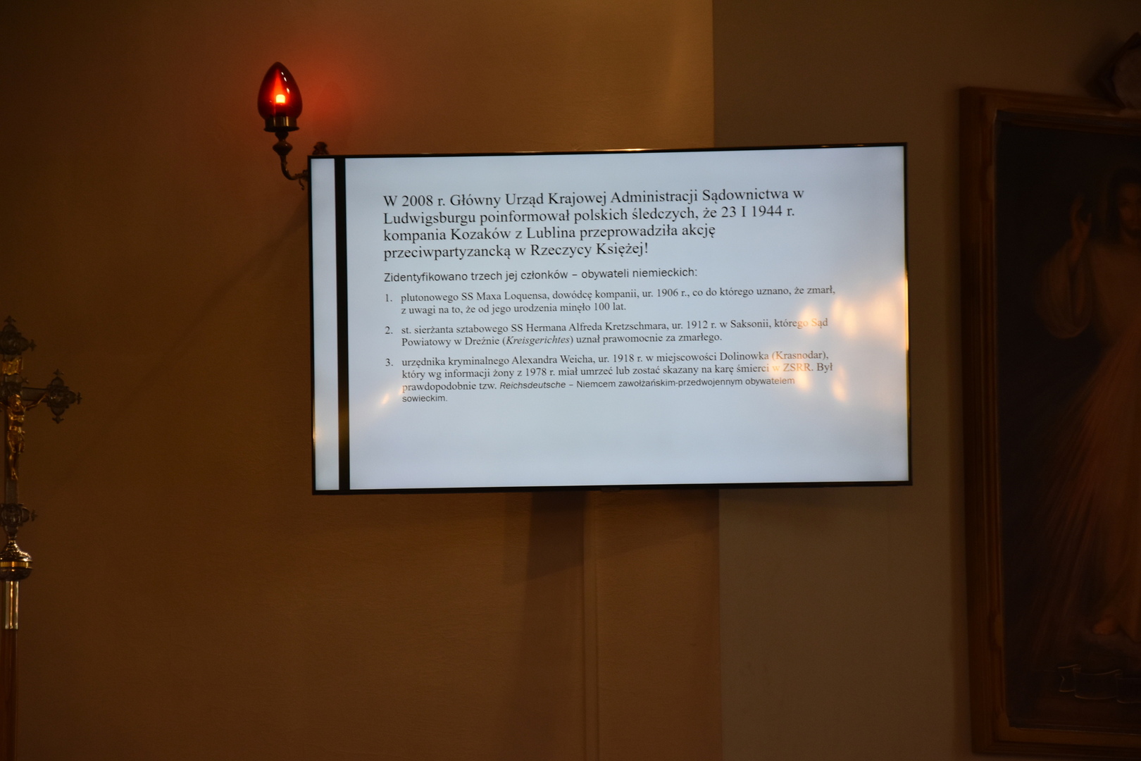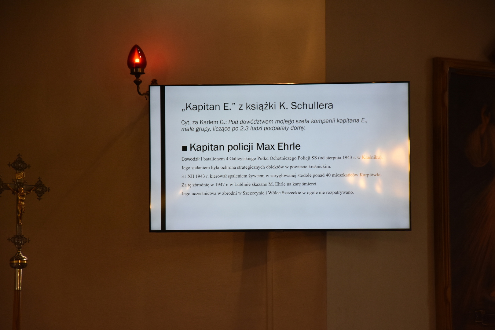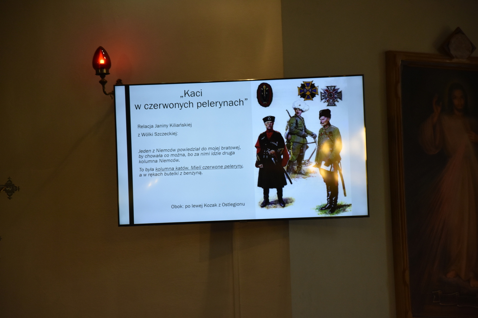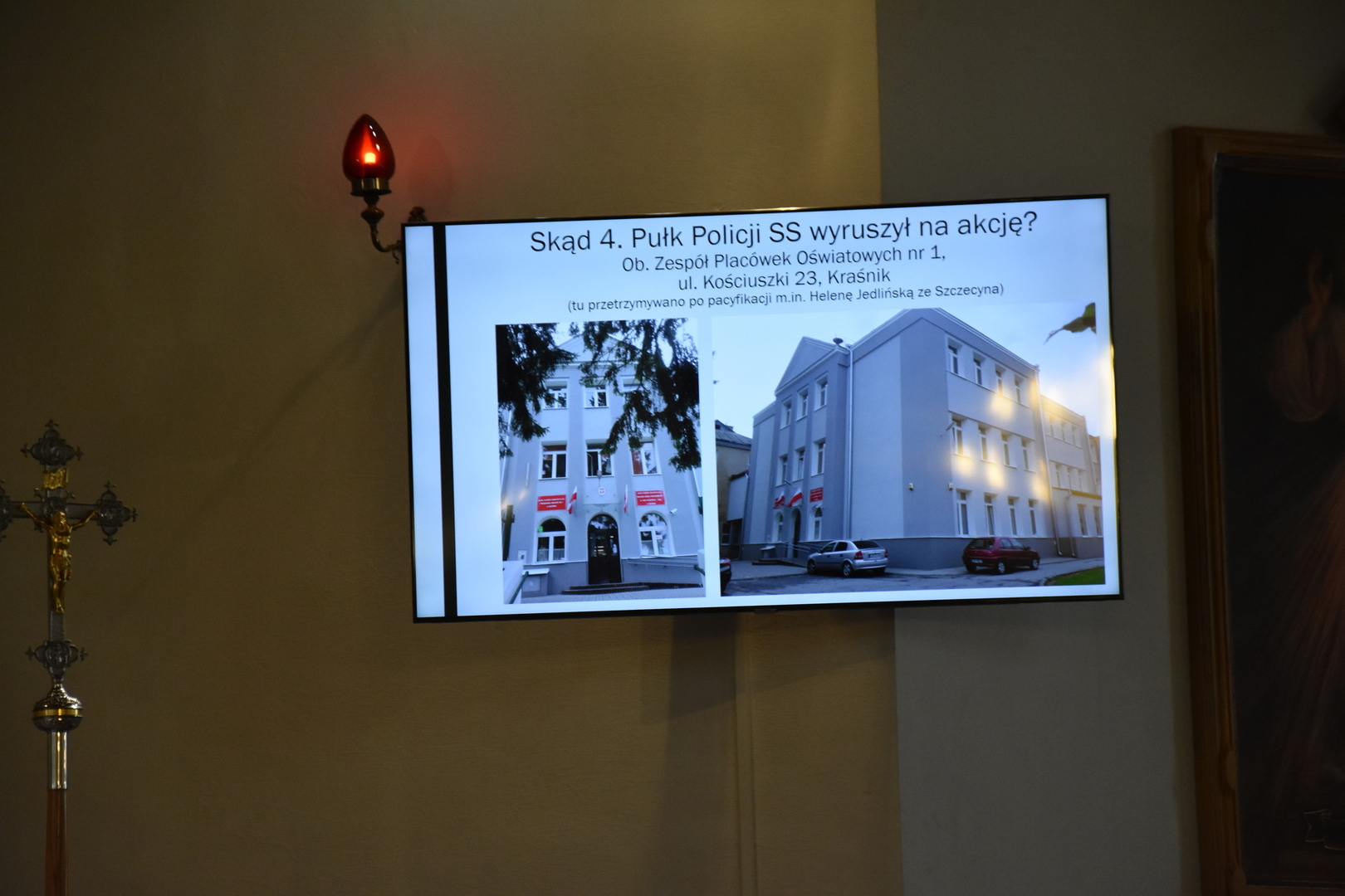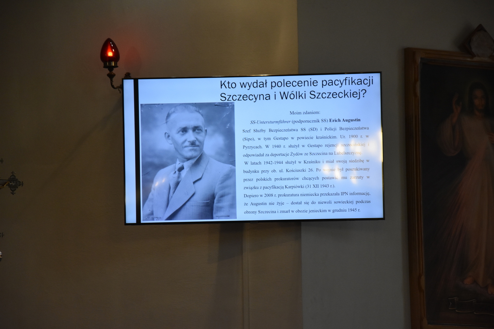 11 lutego br. w Kościele pw. Św. Maksymiliana Kolbe w Szczecynie o godzinie 9:00 odbyła się Msza Święta, po której dr Dominik Szulc pracownik Instytutu Pamięci Narodowej w Szczecynie zaprezentował zgromadzone Informacje na temat Pacyfikacji Wsi Szczecyn, Wólka Szczecka oraz pobliskich okolic z 1944 roku.