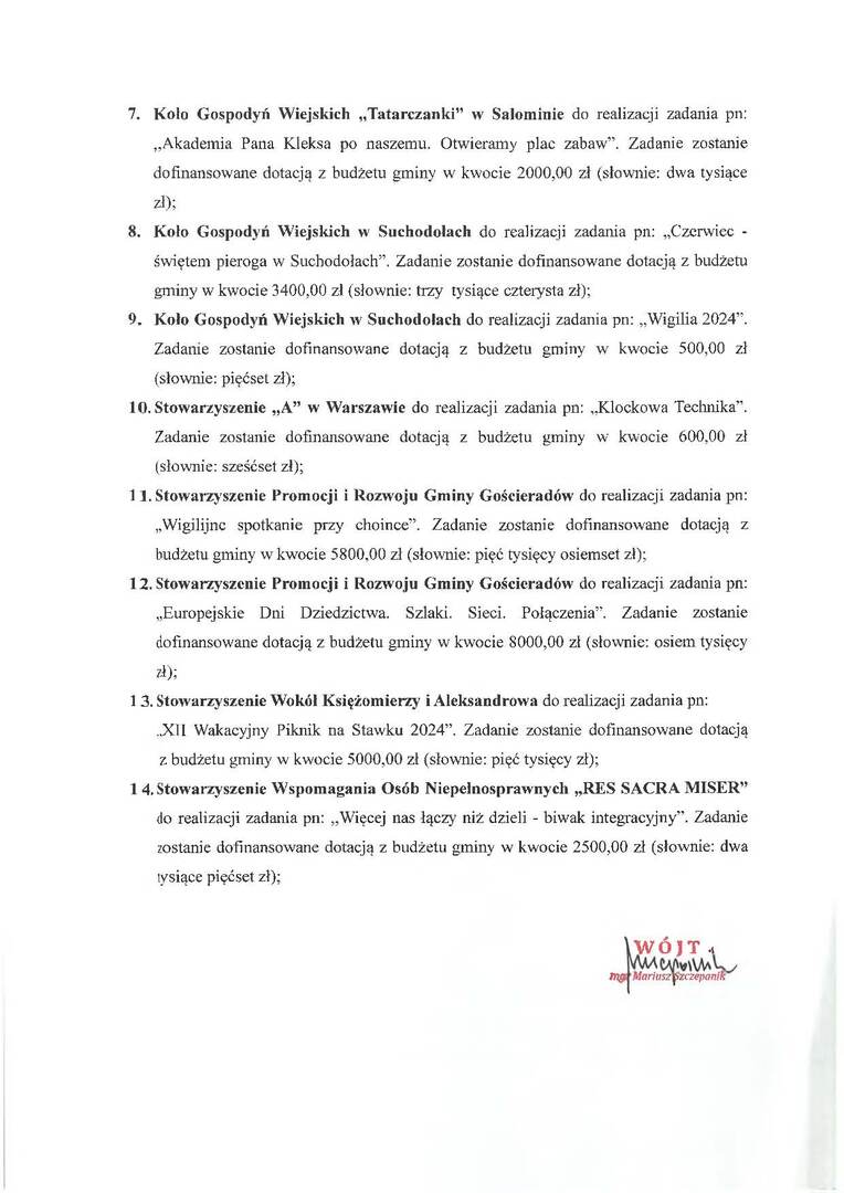 9. Koło Gospodyń Wiejskich w Suchodołach do realizacji zadania pn: „Wigilia 2024”. Zadanie zostanie dofinansowane dotacją z budżetu gminy w kwocie 500,00 zł (słownie: pięćset zł);